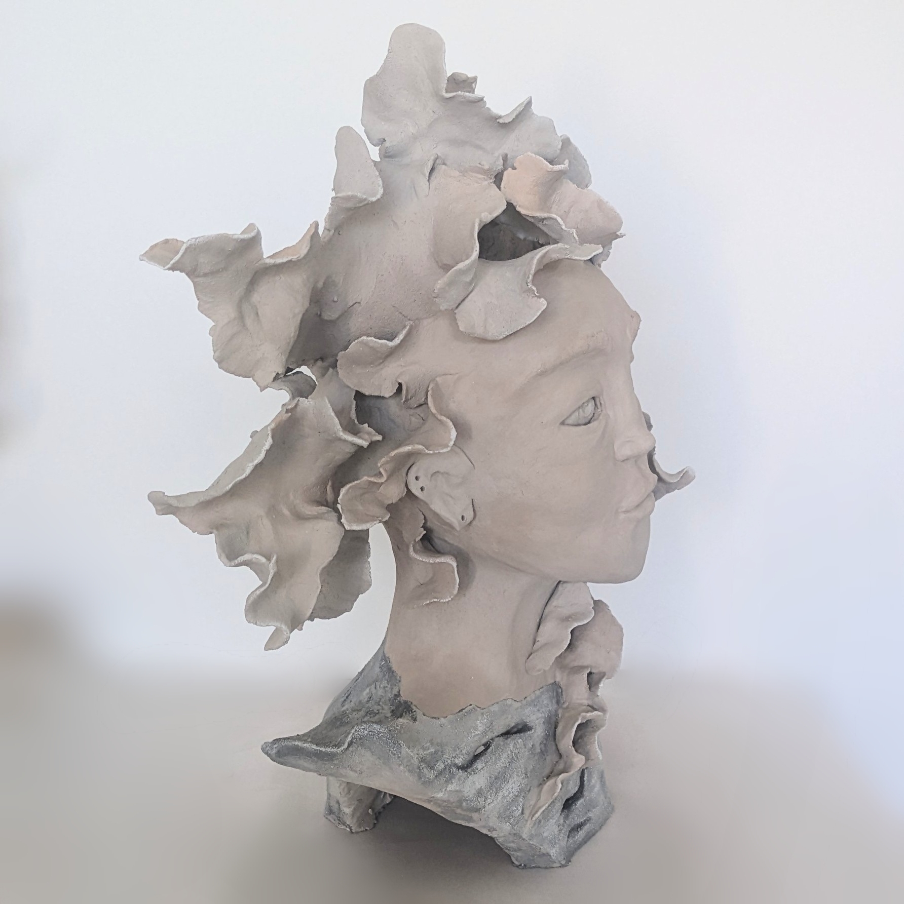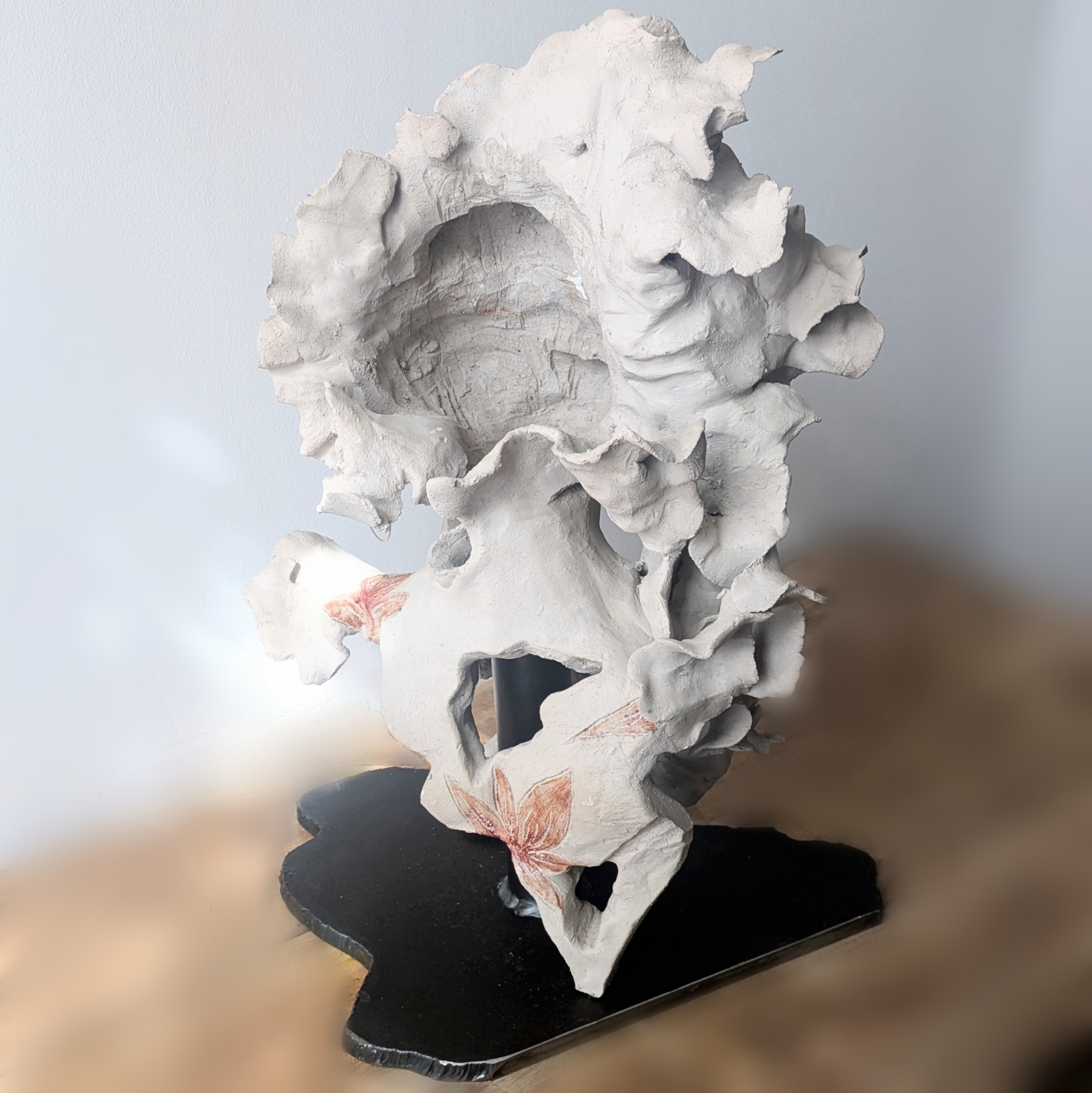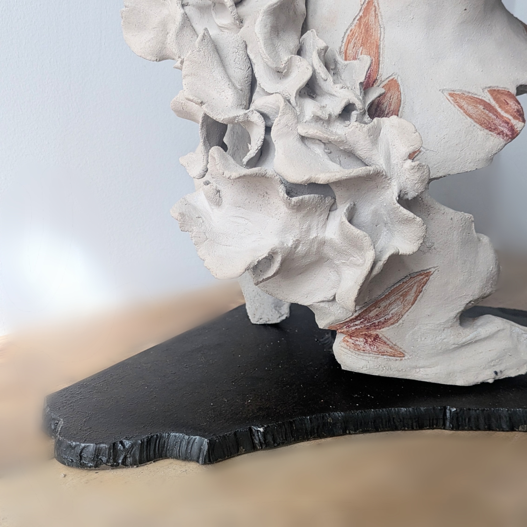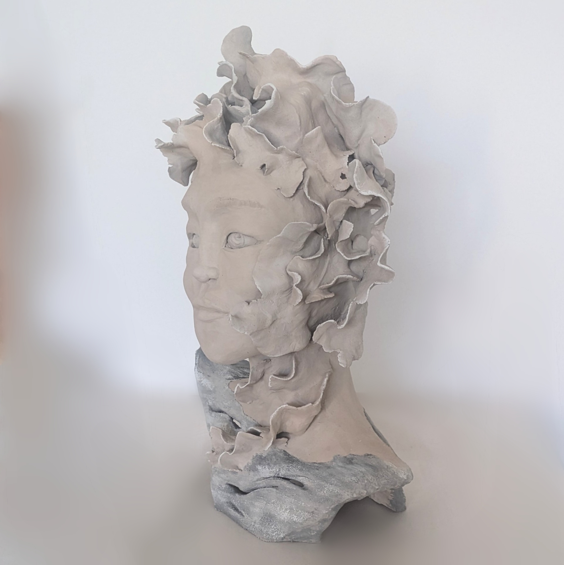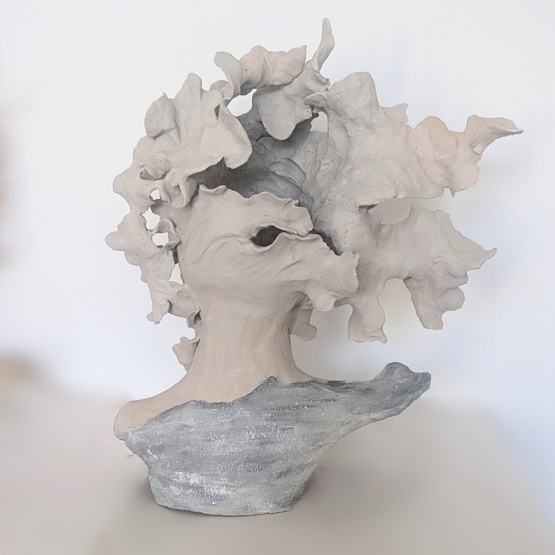 Façonnée de A à Z, depuis la préparation de la terre brute jusqu’à la mise en forme finale. Le modelage a ensuite donné naissance à Gesse qui tire son nom du lieu où elle est née. Elle semble émerger d’un rêve avec des formes florales et minérales se déploient comme une chevelure habitée par le souffle du vent. La matière brute se mêle à des éclats argentés, rappelant la danse entre la nature et l’imaginaire. Ancrée sur son socle de bois, la sculpture paraît à la fois fragment d’écorce et apparition fugitive, messagère d’un autre monde.