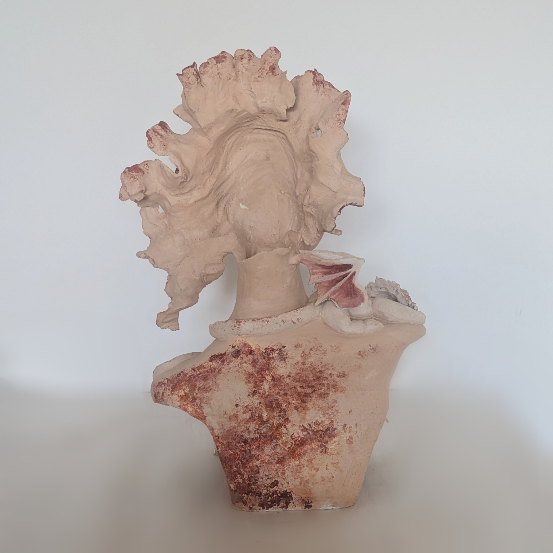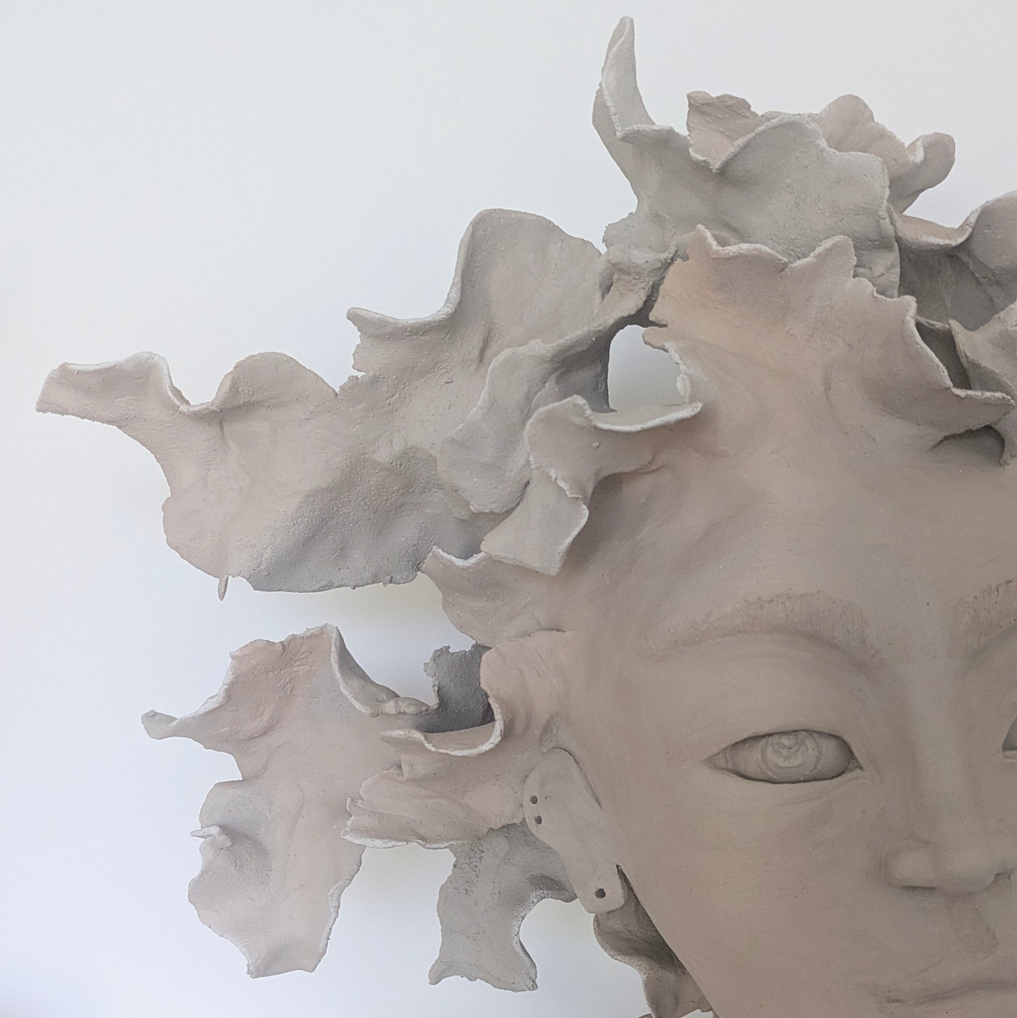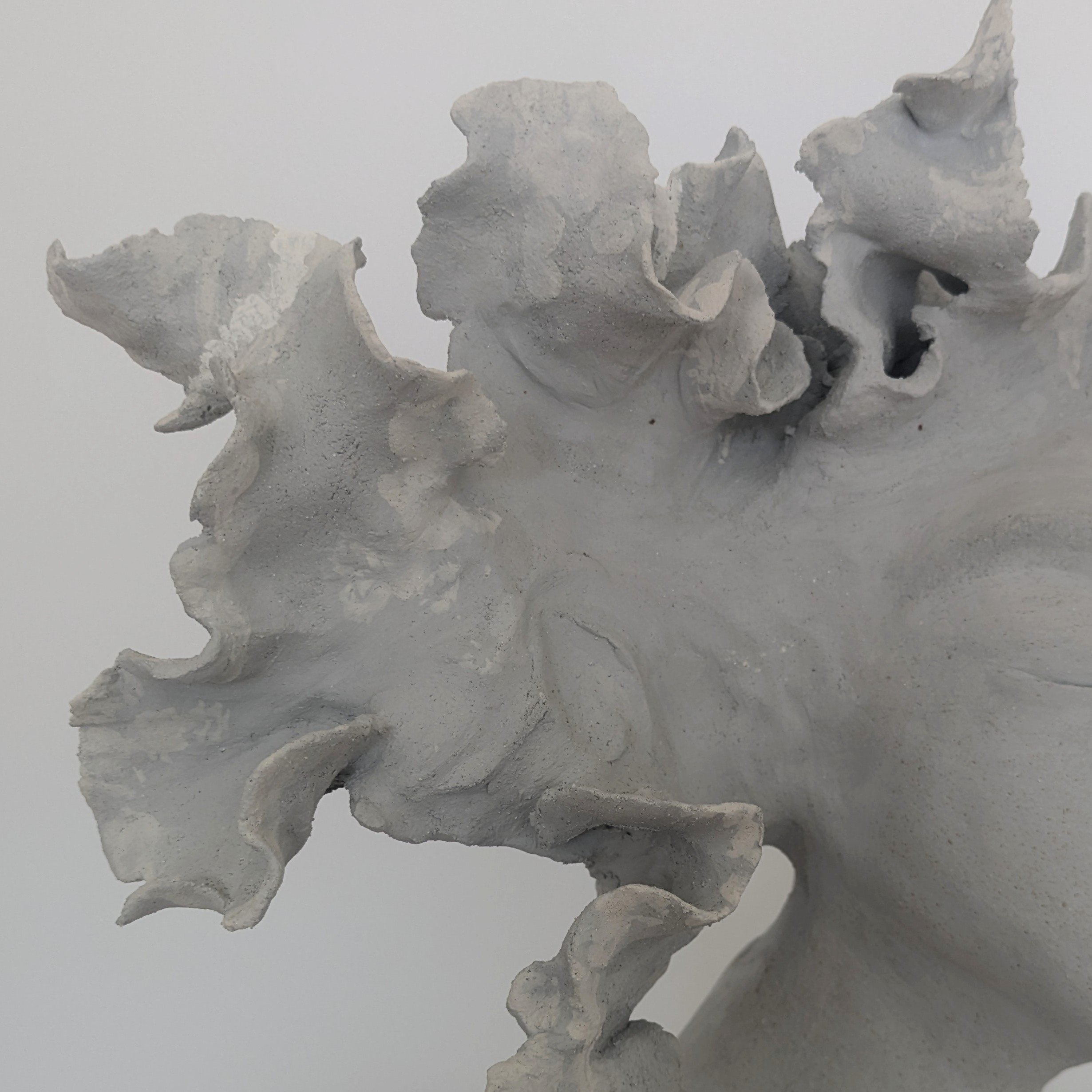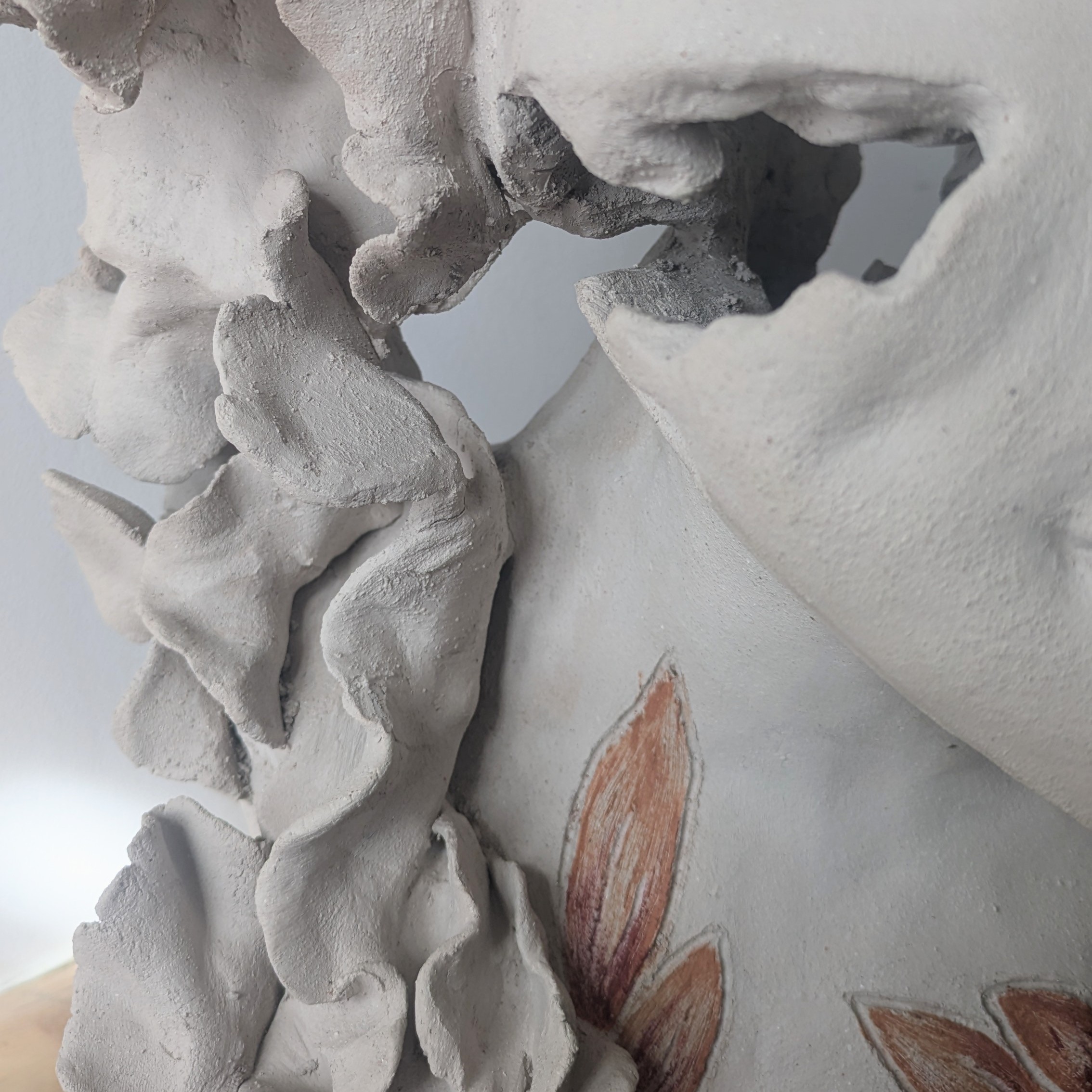 Façonnée de A à Z, depuis la préparation de la terre brute jusqu’à la mise en forme finale. Le modelage a ensuite donné naissance à Gesse qui tire son nom du lieu où elle est née. Elle semble émerger d’un rêve avec des formes florales et minérales se déploient comme une chevelure habitée par le souffle du vent. La matière brute se mêle à des éclats argentés, rappelant la danse entre la nature et l’imaginaire. Ancrée sur son socle de bois, la sculpture paraît à la fois fragment d’écorce et apparition fugitive, messagère d’un autre monde.
