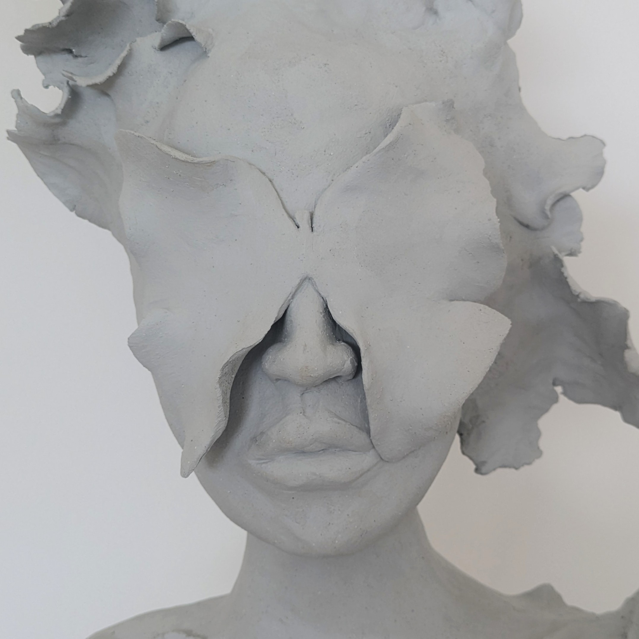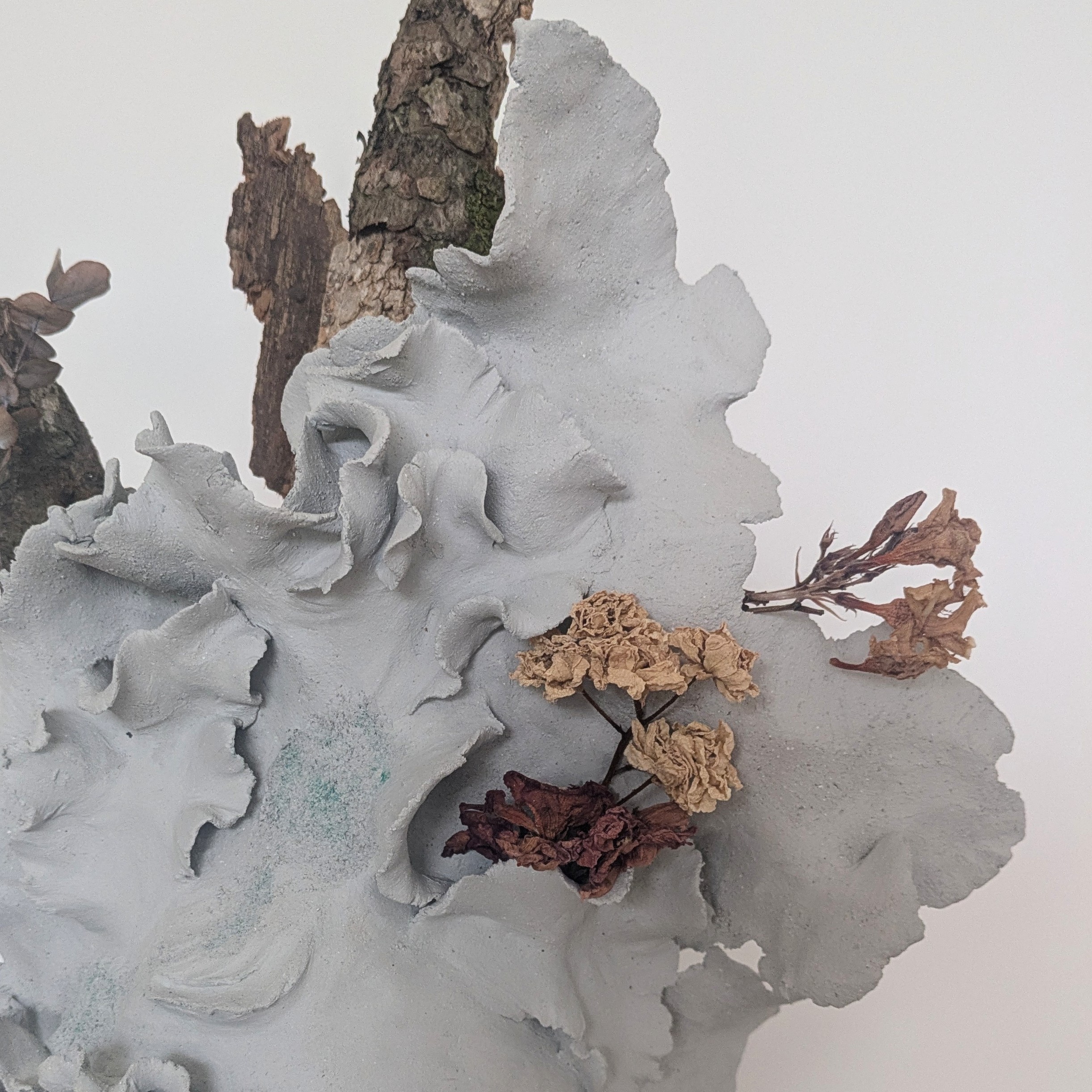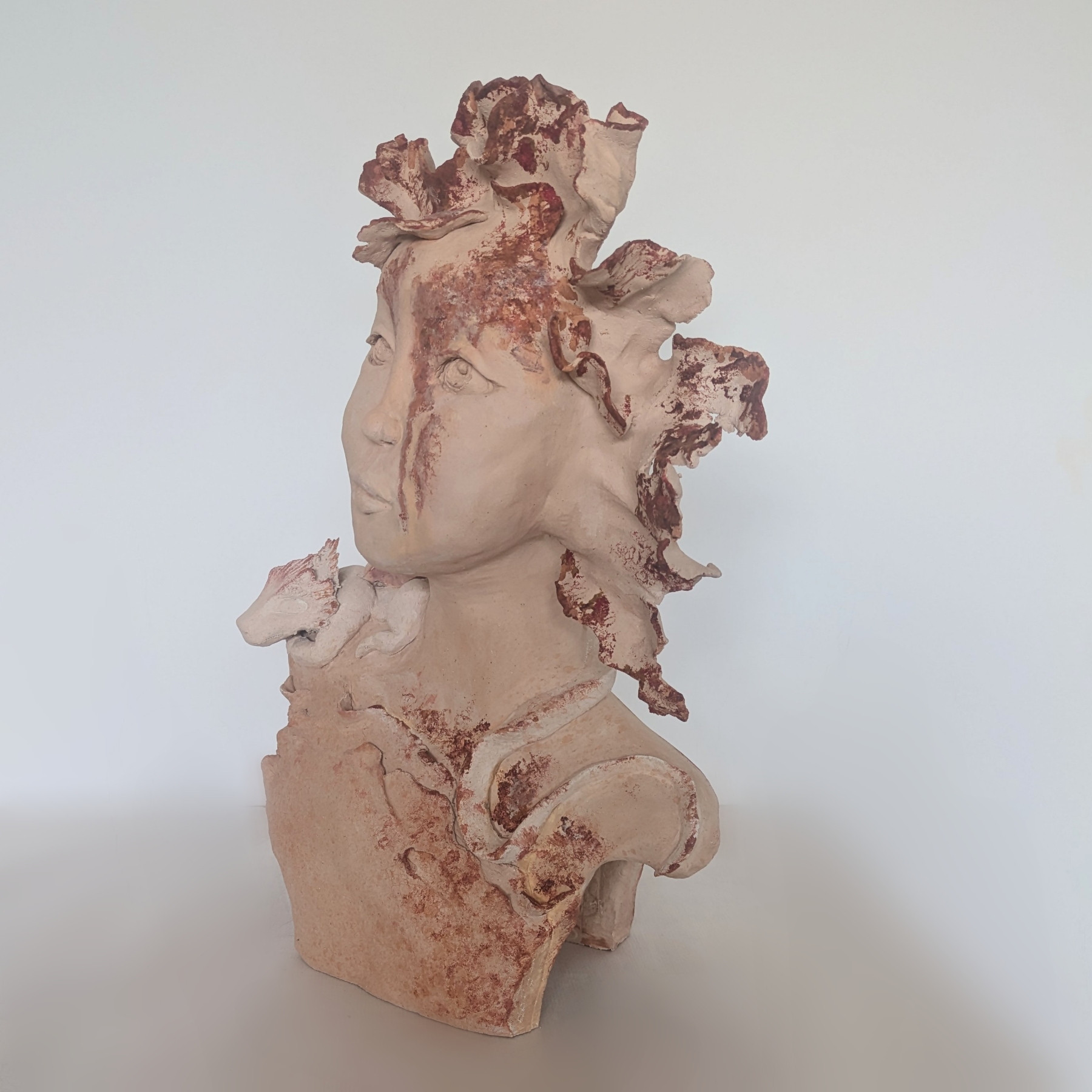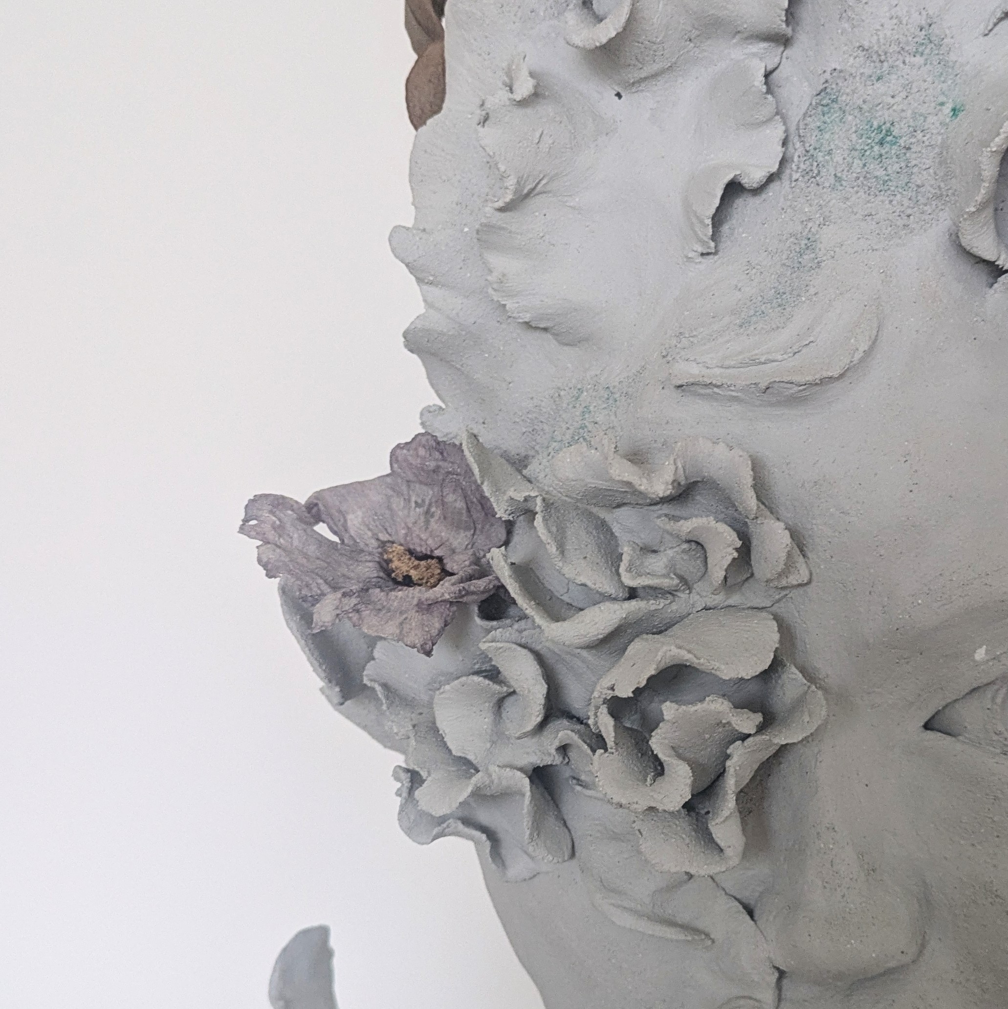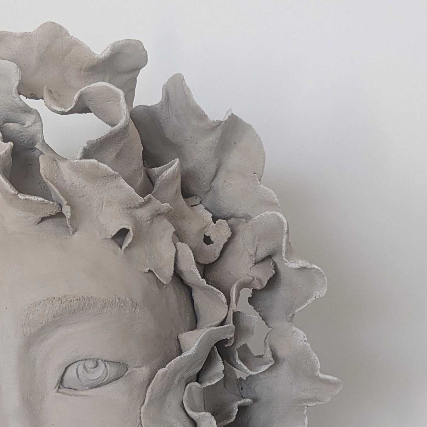 Façonnée de A à Z, depuis la préparation de la terre brute jusqu’à la mise en forme finale. Le modelage a ensuite donné naissance à Gesse qui tire son nom du lieu où elle est née. Elle semble émerger d’un rêve avec des formes florales et minérales se déploient comme une chevelure habitée par le souffle du vent. La matière brute se mêle à des éclats argentés, rappelant la danse entre la nature et l’imaginaire. Ancrée sur son socle de bois, la sculpture paraît à la fois fragment d’écorce et apparition fugitive, messagère d’un autre monde.