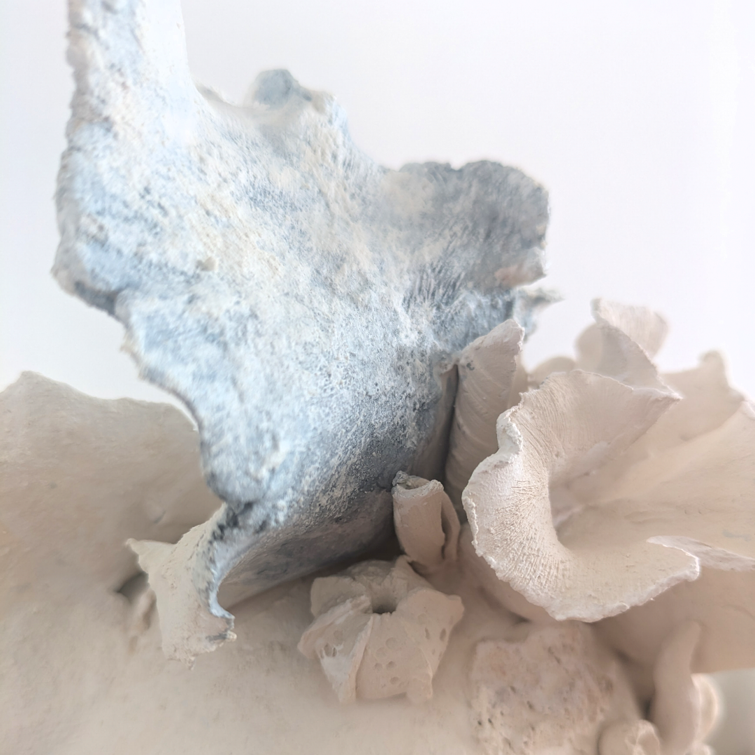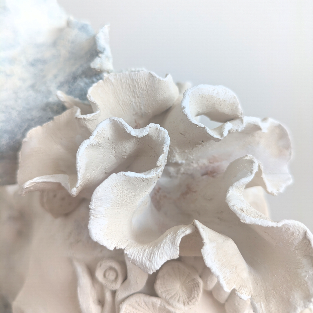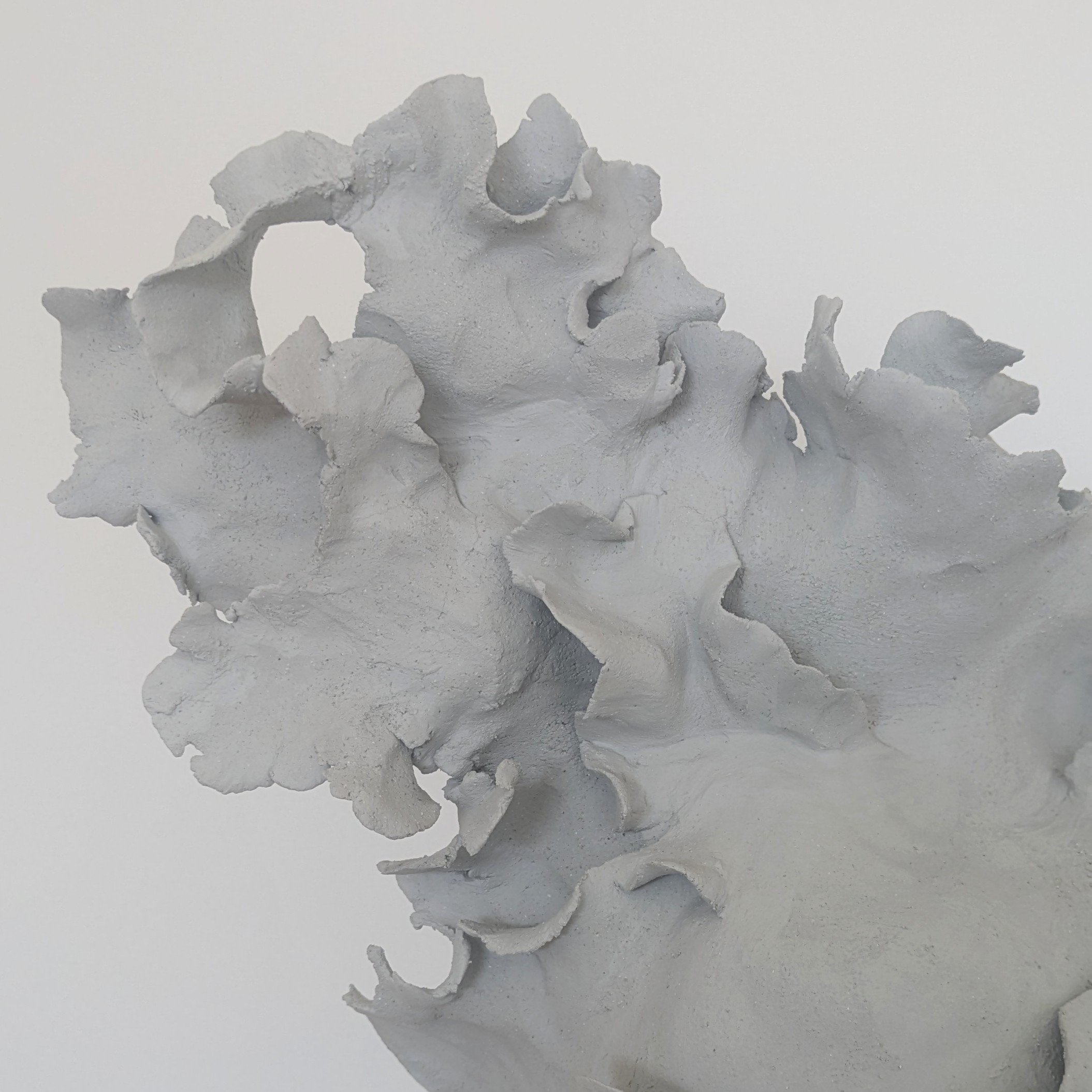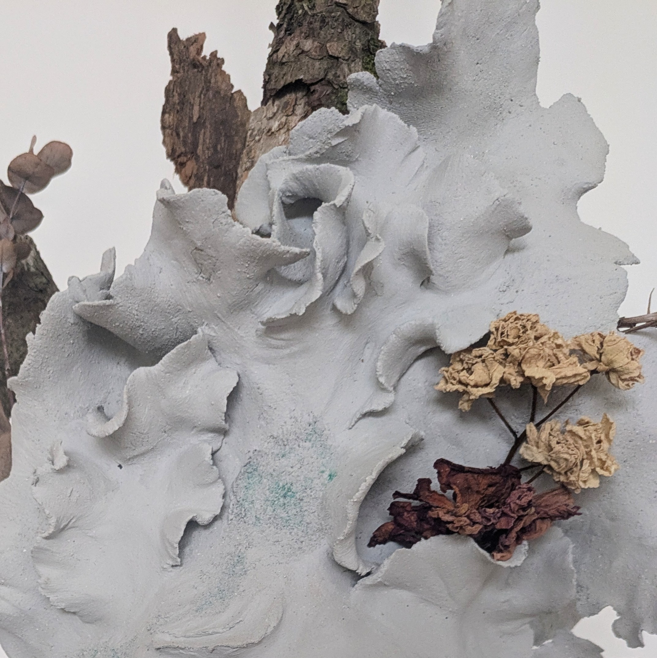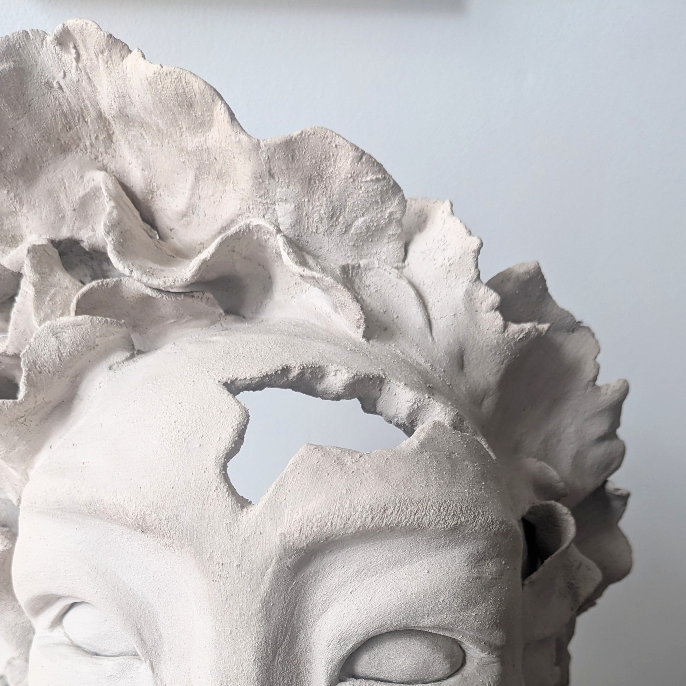 Façonnée de A à Z, depuis la préparation de la terre brute jusqu’à la mise en forme finale. Le modelage a ensuite donné naissance à Gesse qui tire son nom du lieu où elle est née. Elle semble émerger d’un rêve avec des formes florales et minérales se déploient comme une chevelure habitée par le souffle du vent. La matière brute se mêle à des éclats argentés, rappelant la danse entre la nature et l’imaginaire. Ancrée sur son socle de bois, la sculpture paraît à la fois fragment d’écorce et apparition fugitive, messagère d’un autre monde.