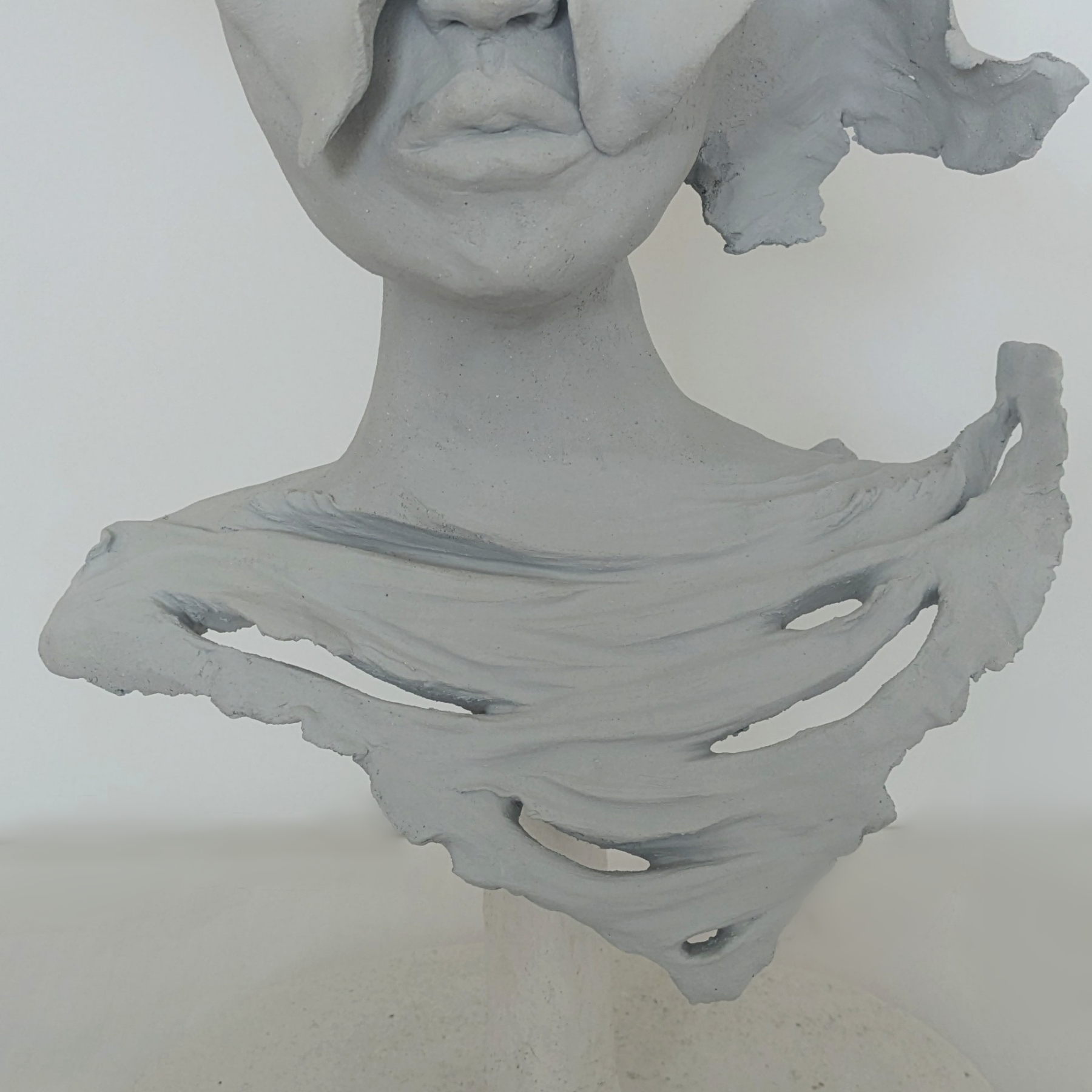 Cette statue en argile évoque une féminité douce et poétique à travers ses lignes épurées et son expression sereine. Son visage, délicatement sculpté, dégage un calme profond grâce à ses traits fins et harmonieux. Ses yeux énigmatiques invitent à l’introspection. Son turban ondulant, semble flotter délicatement autour de sa tête. L’ensemble dégage une grâce intemporelle, célébrant à la fois la délicatesse, la pureté et l’élégance naturelle.