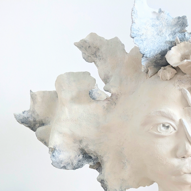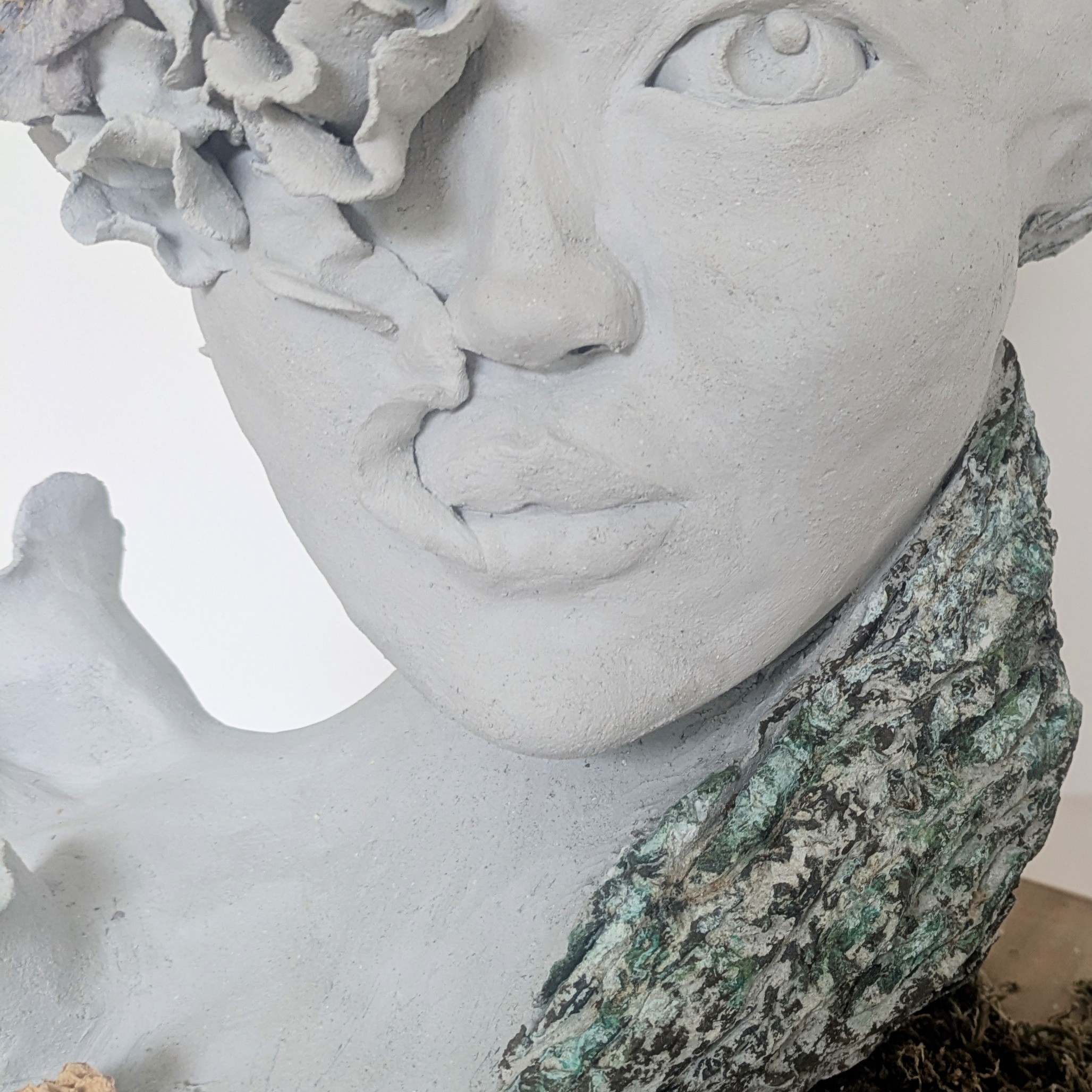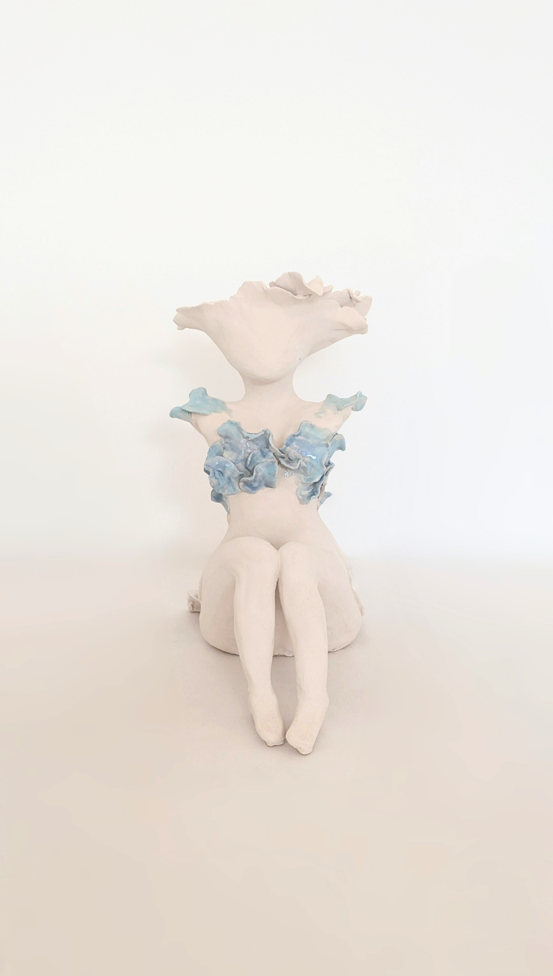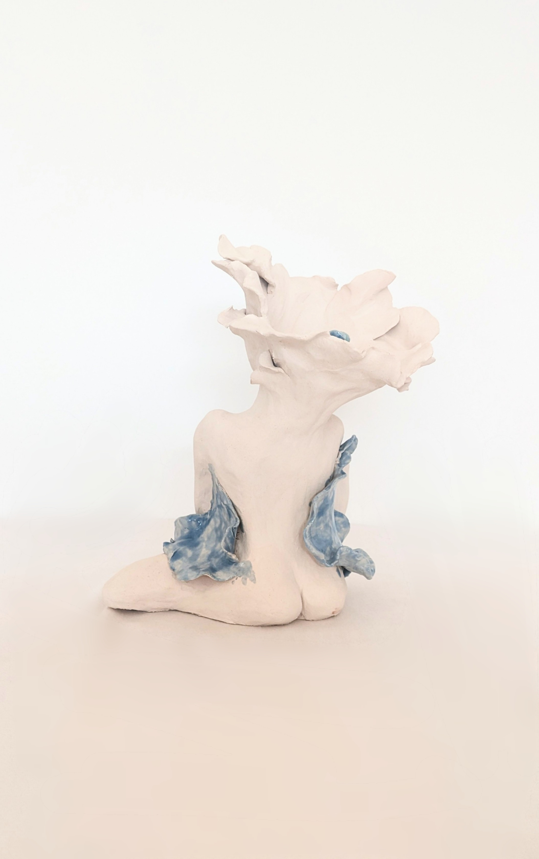 Symbole de la beauté florale et de la douceur de la nature. Cette sculpture représente une nymphe assise, au visage abstrait, entourée de formes délicates et organiques. Une texture bleutée au centre de son buste évoque une connexion profonde avec la nature et l’eau, renforçant son aura mystique et poétique.