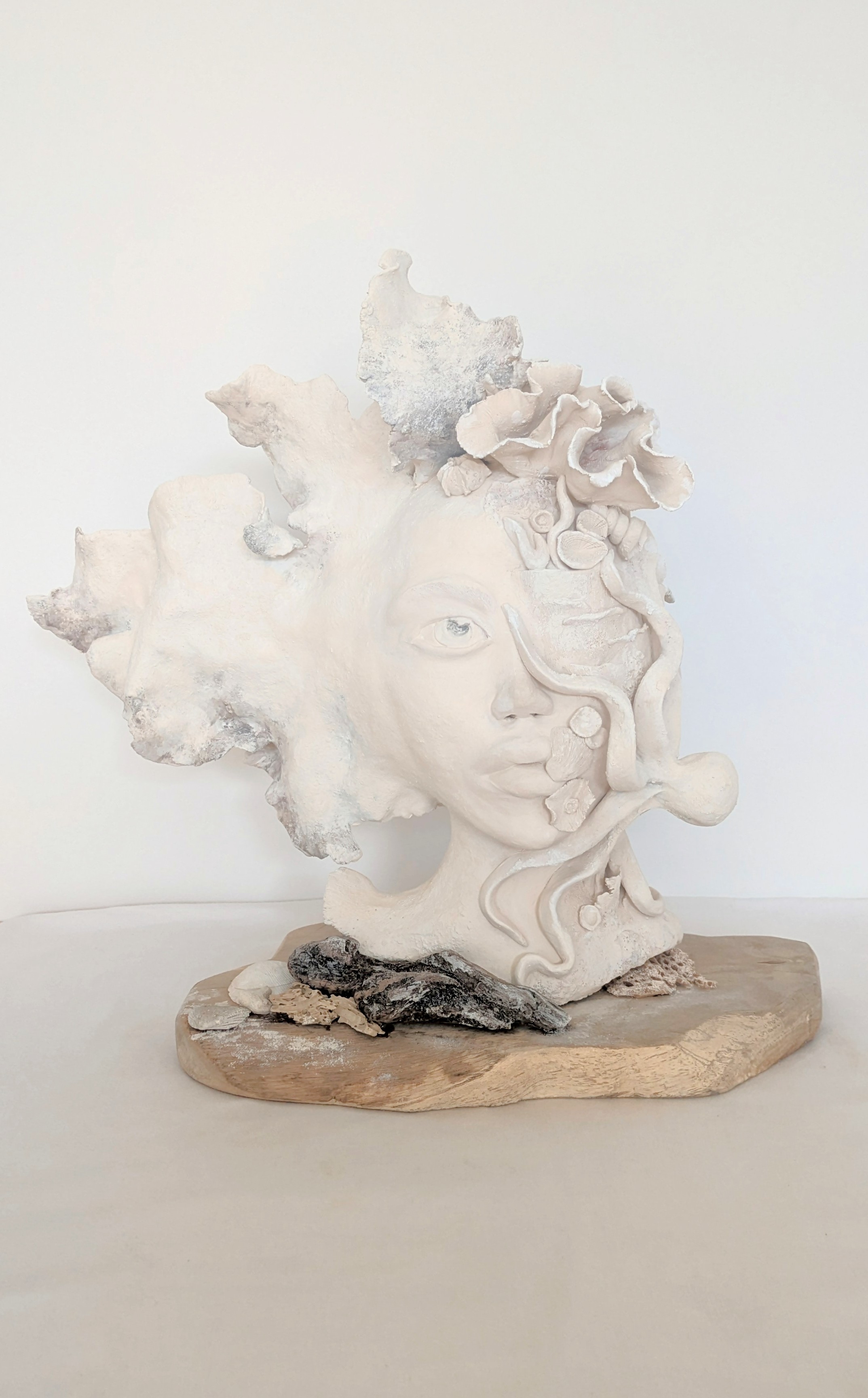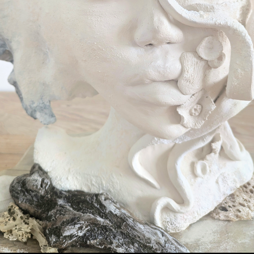 Cette sculpture représente une chimère des océans, incarnant l’élément de l’eau. Ses formes organiques, ondulantes et ses textures rappellent les coraux et les vagues. Elle évoque la fluidité, la vie marine et la fusion entre l’humain et la nature aquatique.
