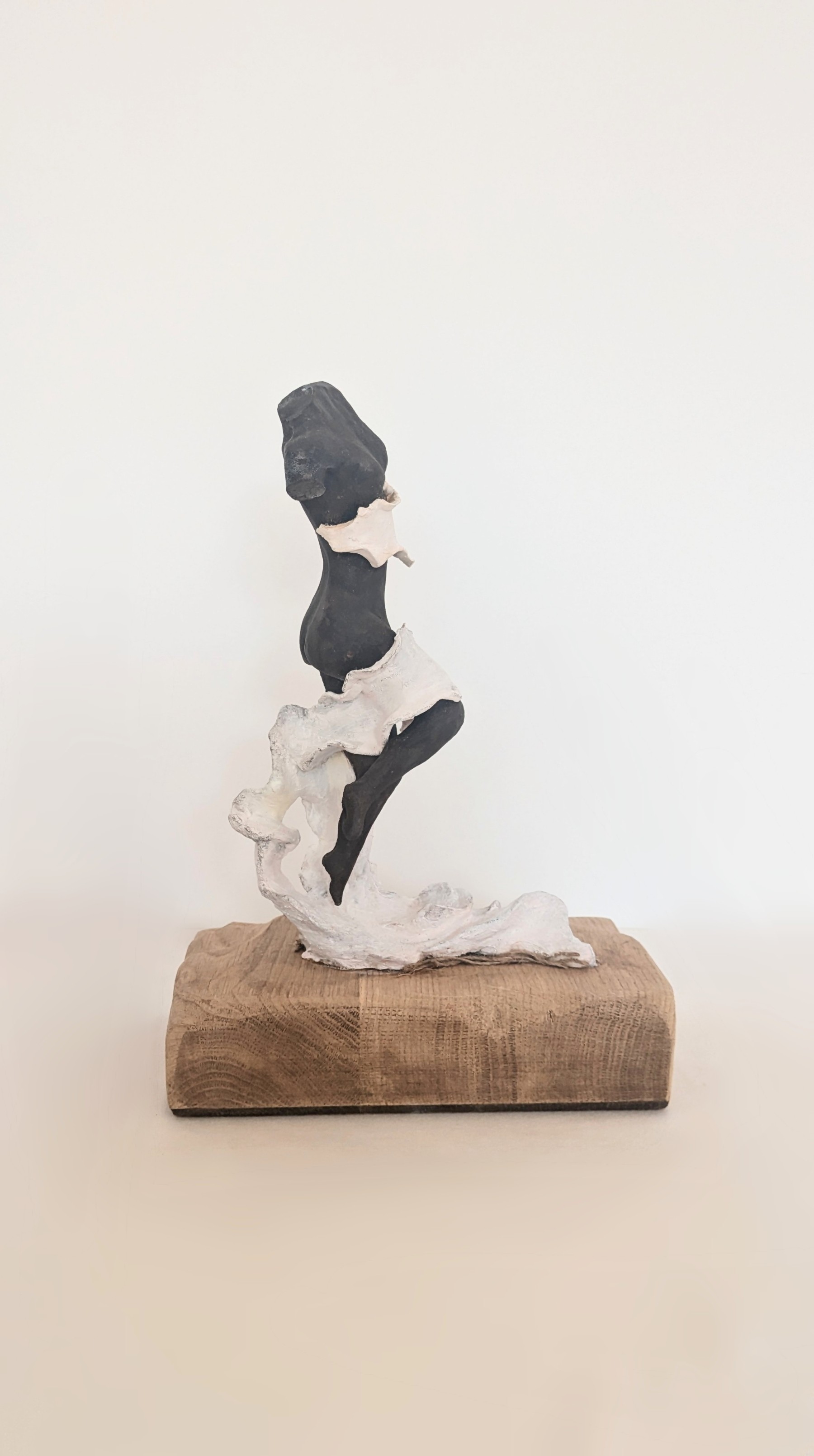Cette sculpture représente une figure élancée en ascension, entourée de formes fluides évoquant des voiles, symbolisant la légèreté et la quête de liberté. La base en bois brut met en valeur ce contraste entre la stabilité terrestre et la dynamique aérienne.