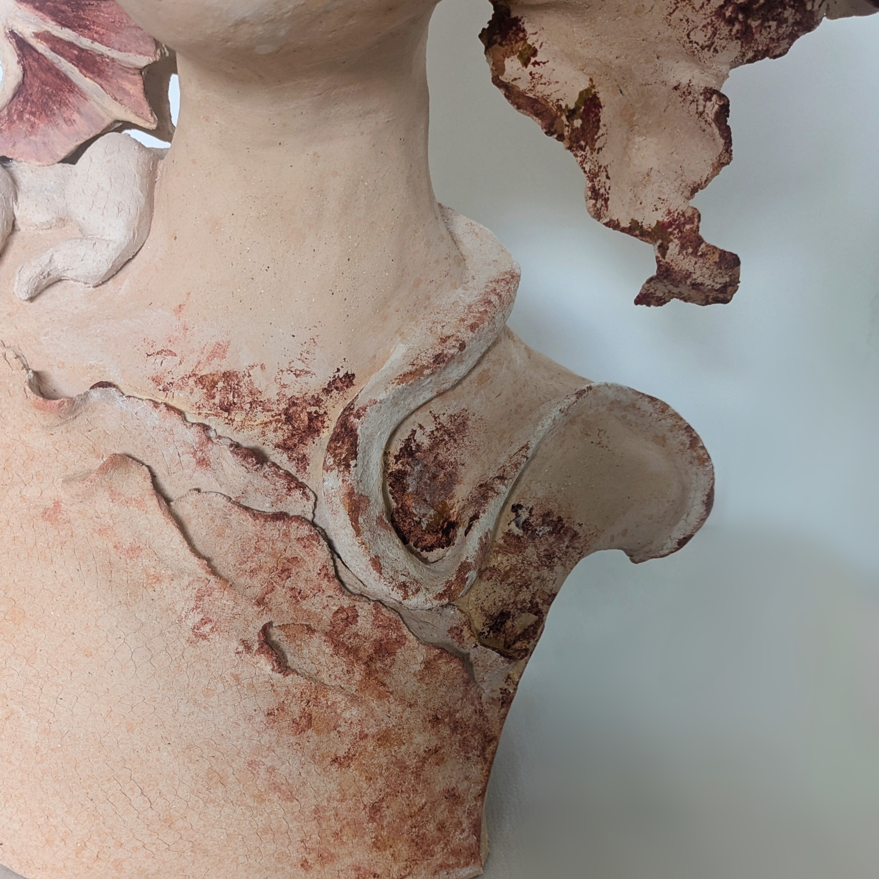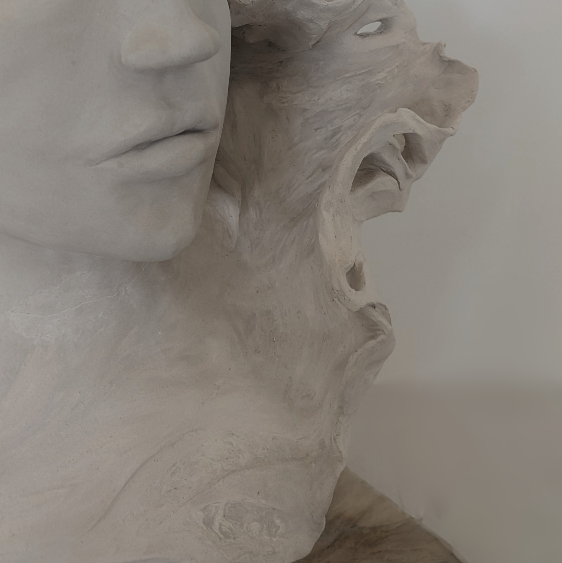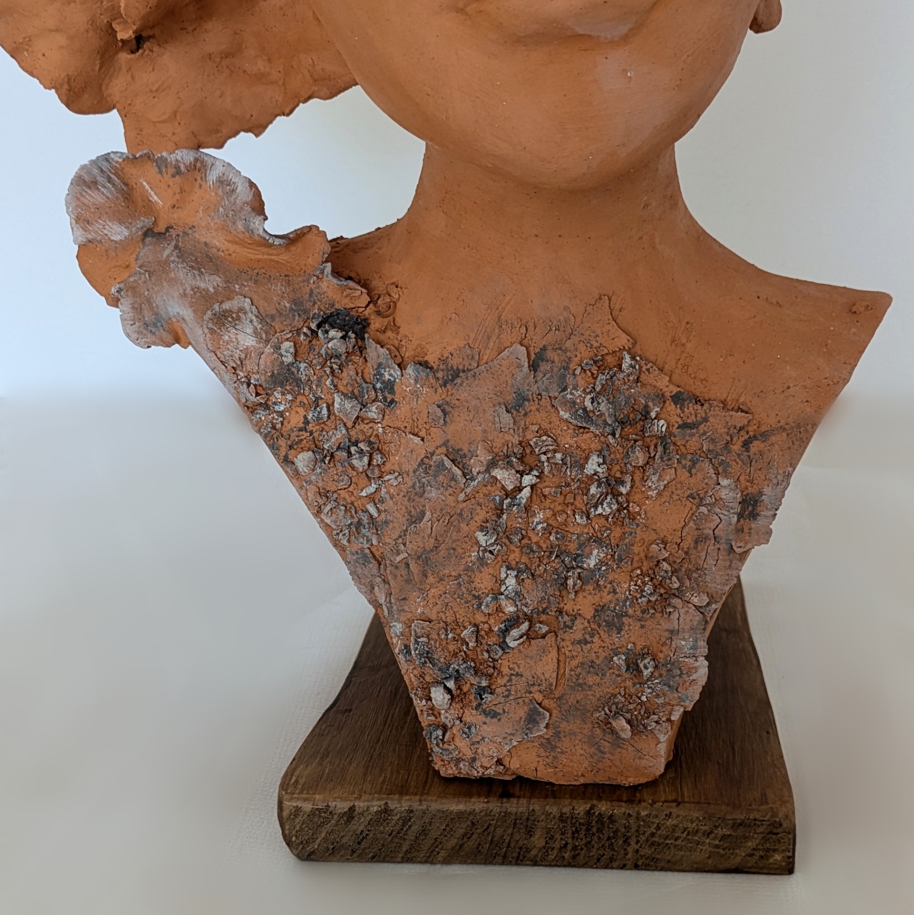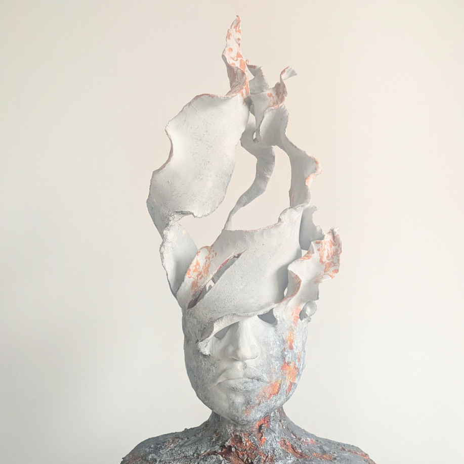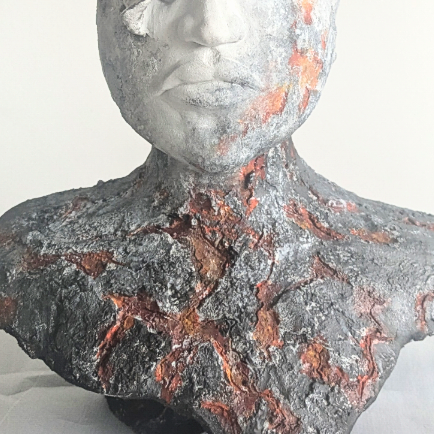 Représentation de l’élément “Feu”. Cette sculpture représente un buste marqué par des textures rugueuses et des tons évoquant le feu et le magma, symbolisant la transformation ou la résilience. La tête brisée, avec des fragments s’élevant comme des flammes, illustre un contraste puissant entre destruction et renouveau.