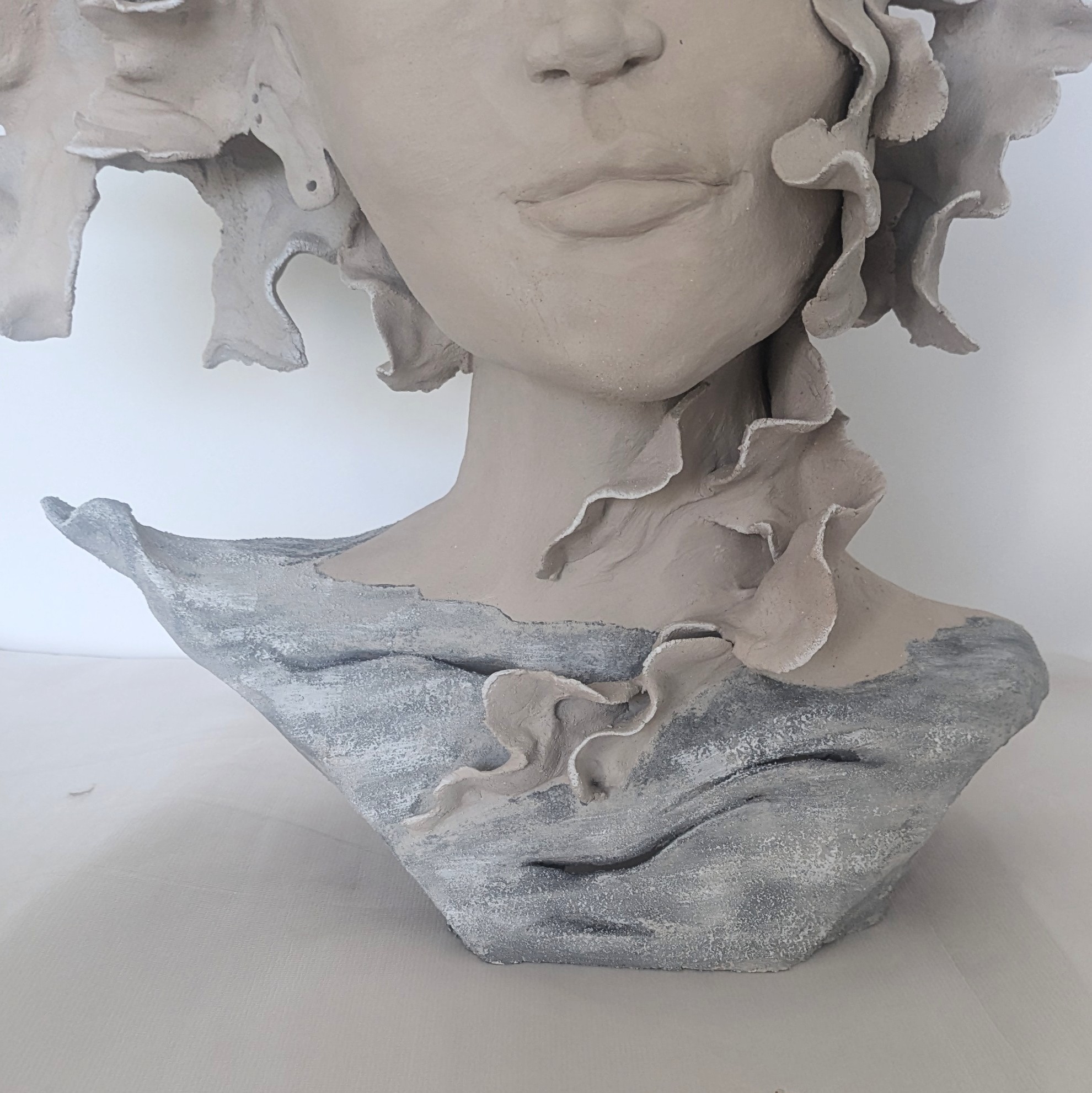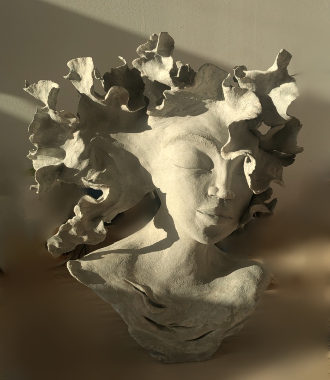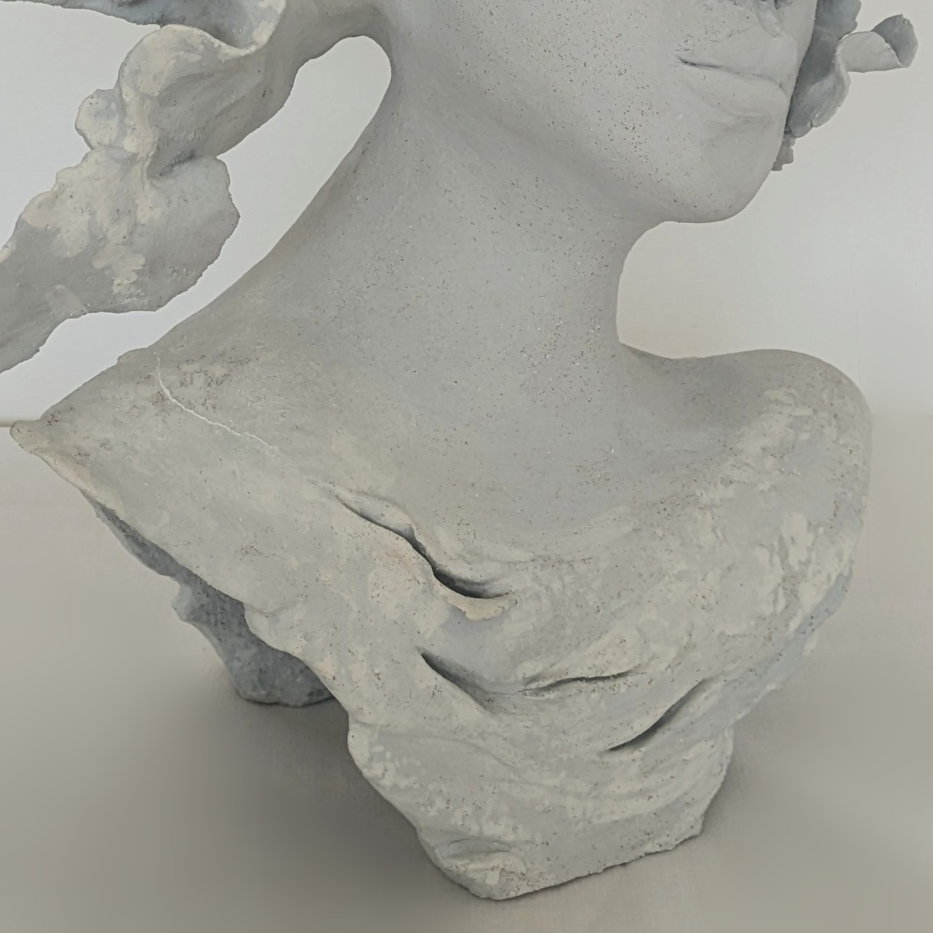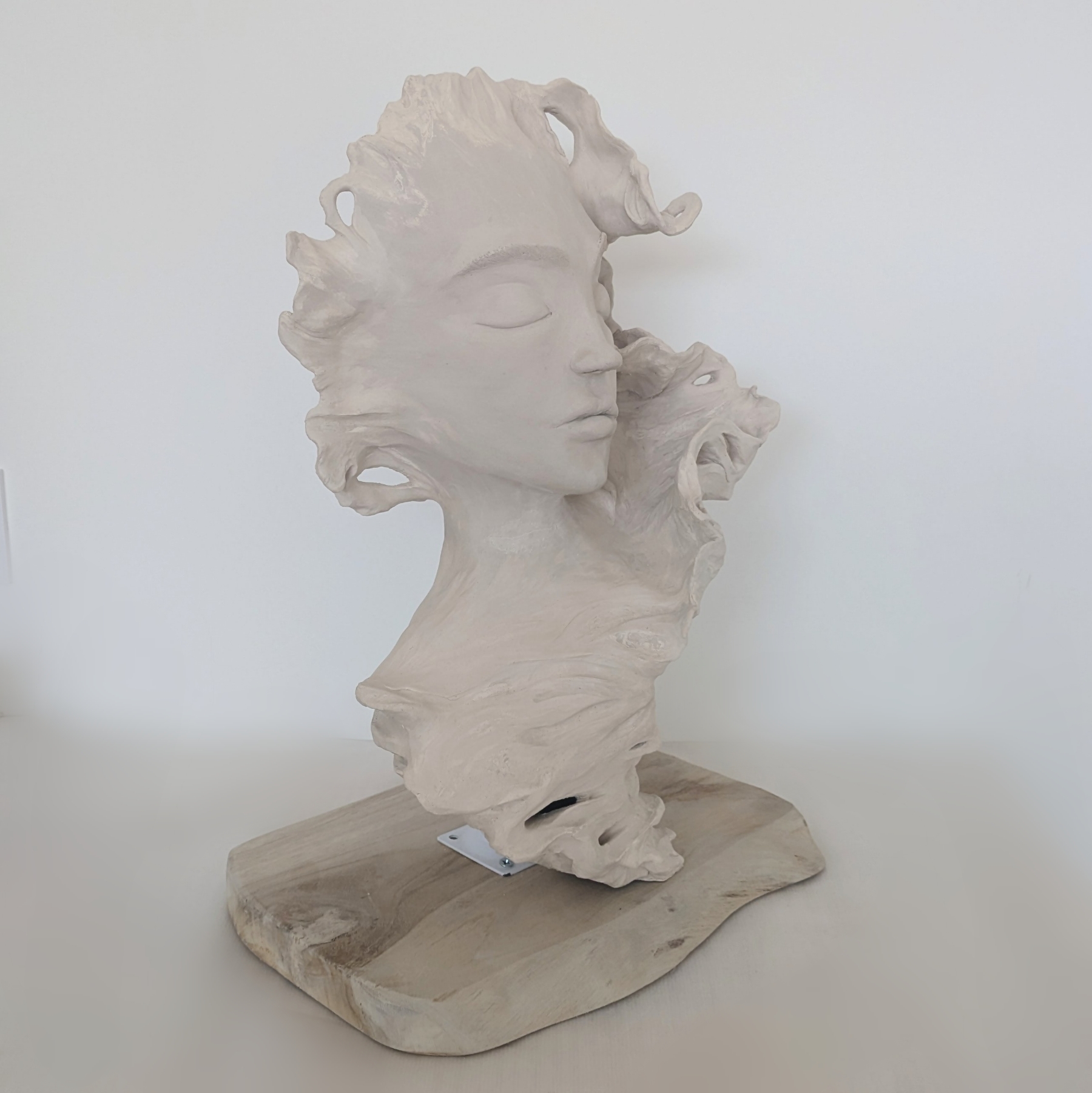 Cette sculpture en grès représente un buste féminin paisible, les yeux fermés. Les cheveux, sculptés avec fluidité et mouvement, semblent s’élever et se dissiper dans l’air, évoquant des vagues. L’ensemble dégage une atmosphère poétique et aérienne, comme si la femme faisait partie des éléments naturels, flottant entre le vent et la terre. La base en bois apporte un contraste chaleureux et naturel à l’ensemble.