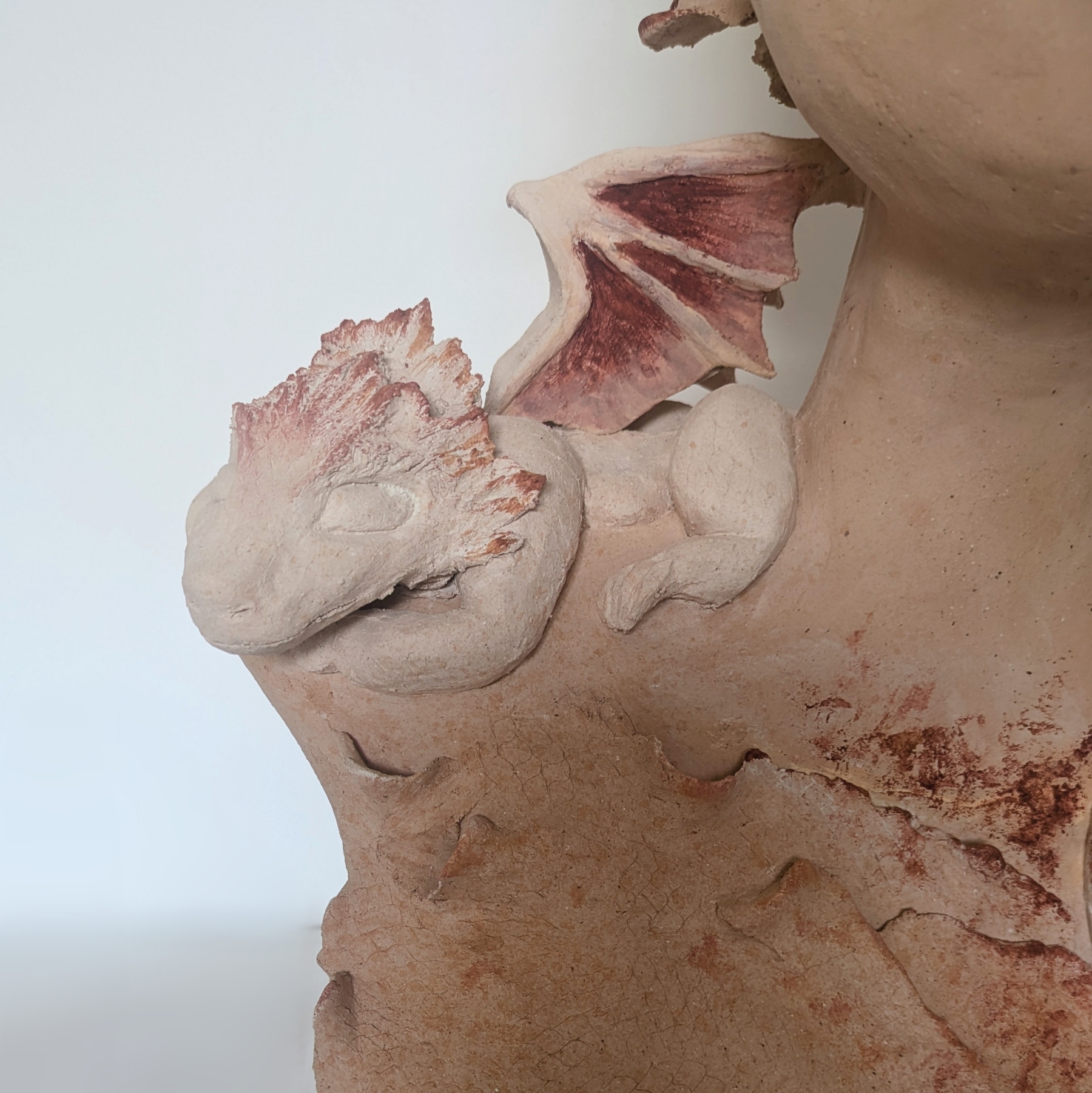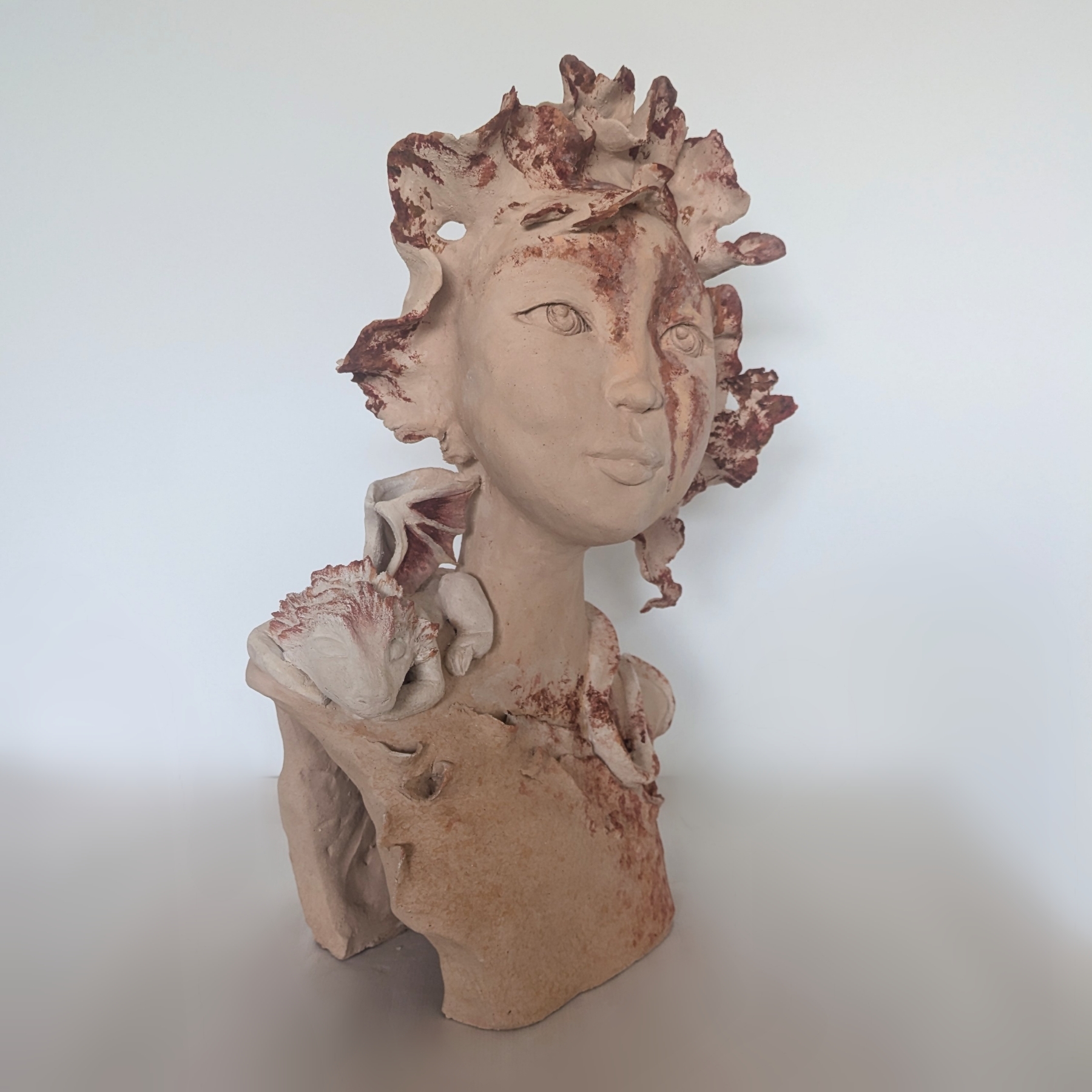 Cette sculpture représente une jeune gardienne du feu, douce et intrépide. Sur son épaule, son ami le dragon est lové, paisible.
