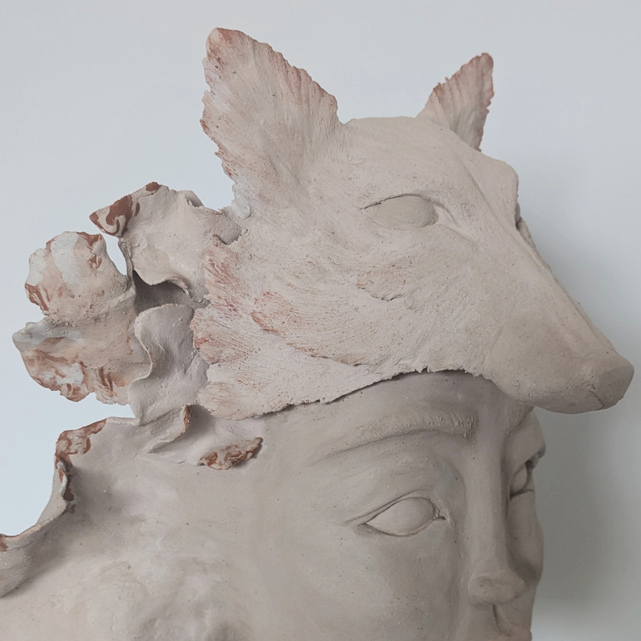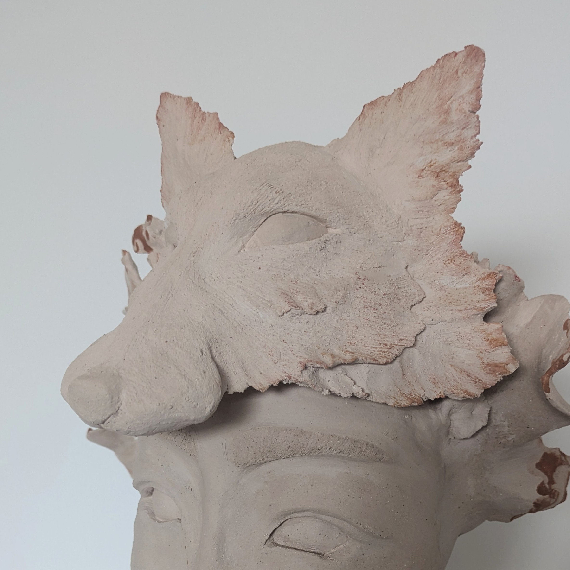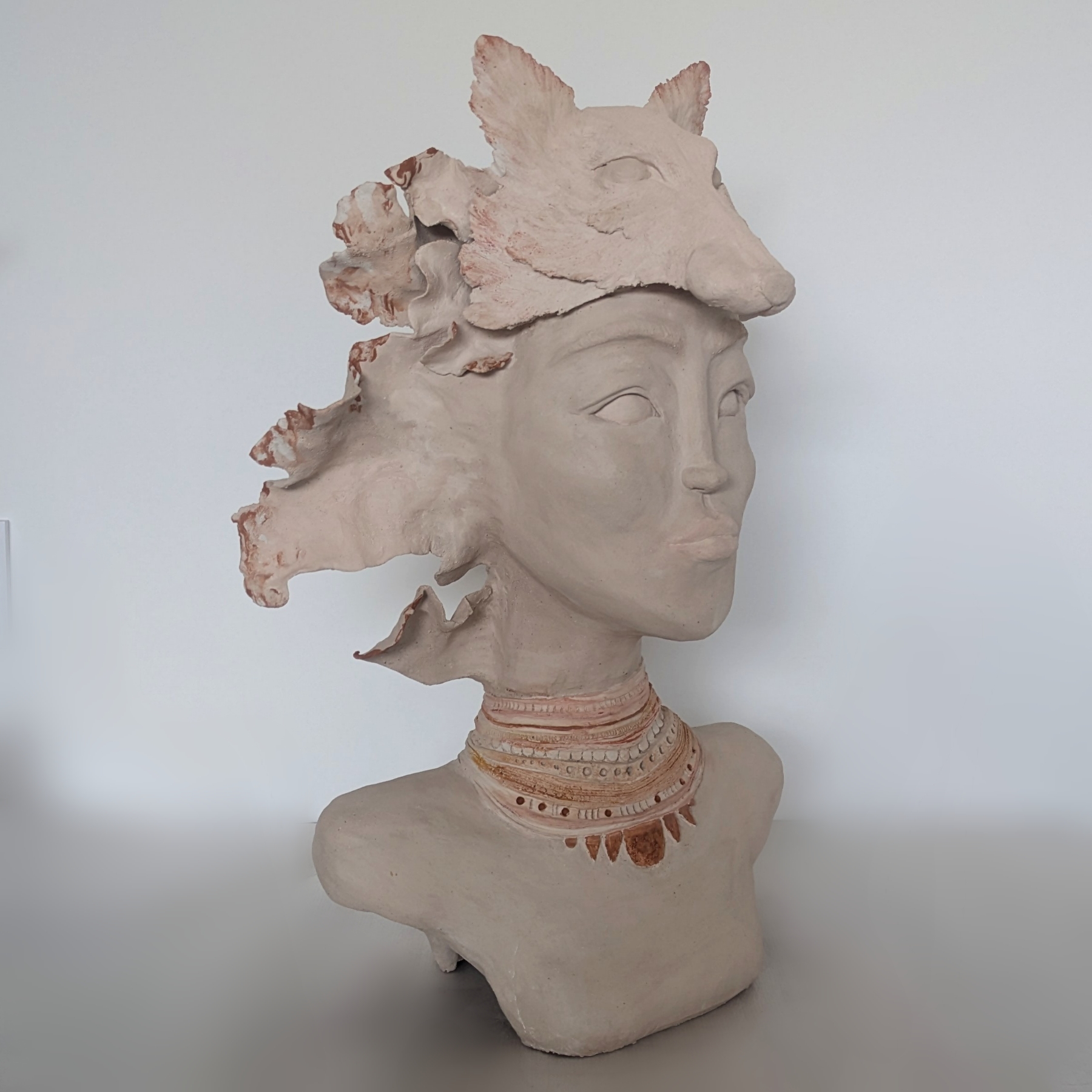 Sculpture représentant un buste féminin, orné d’une coiffe de loup. Les détails gravés et peints du collier renforcent l’aspect tribal et mystique de cette figure à la fois sauvage et tribale.