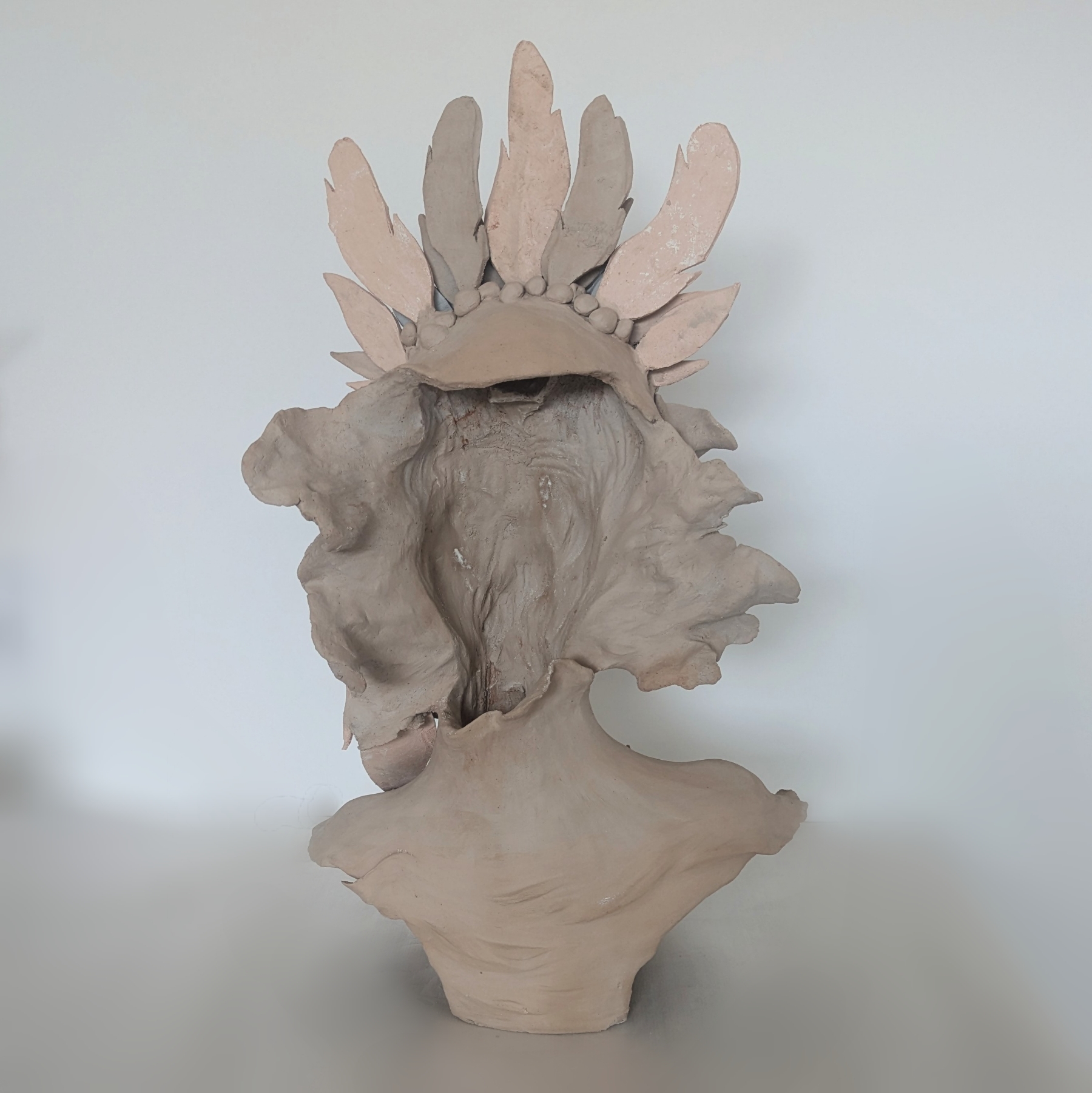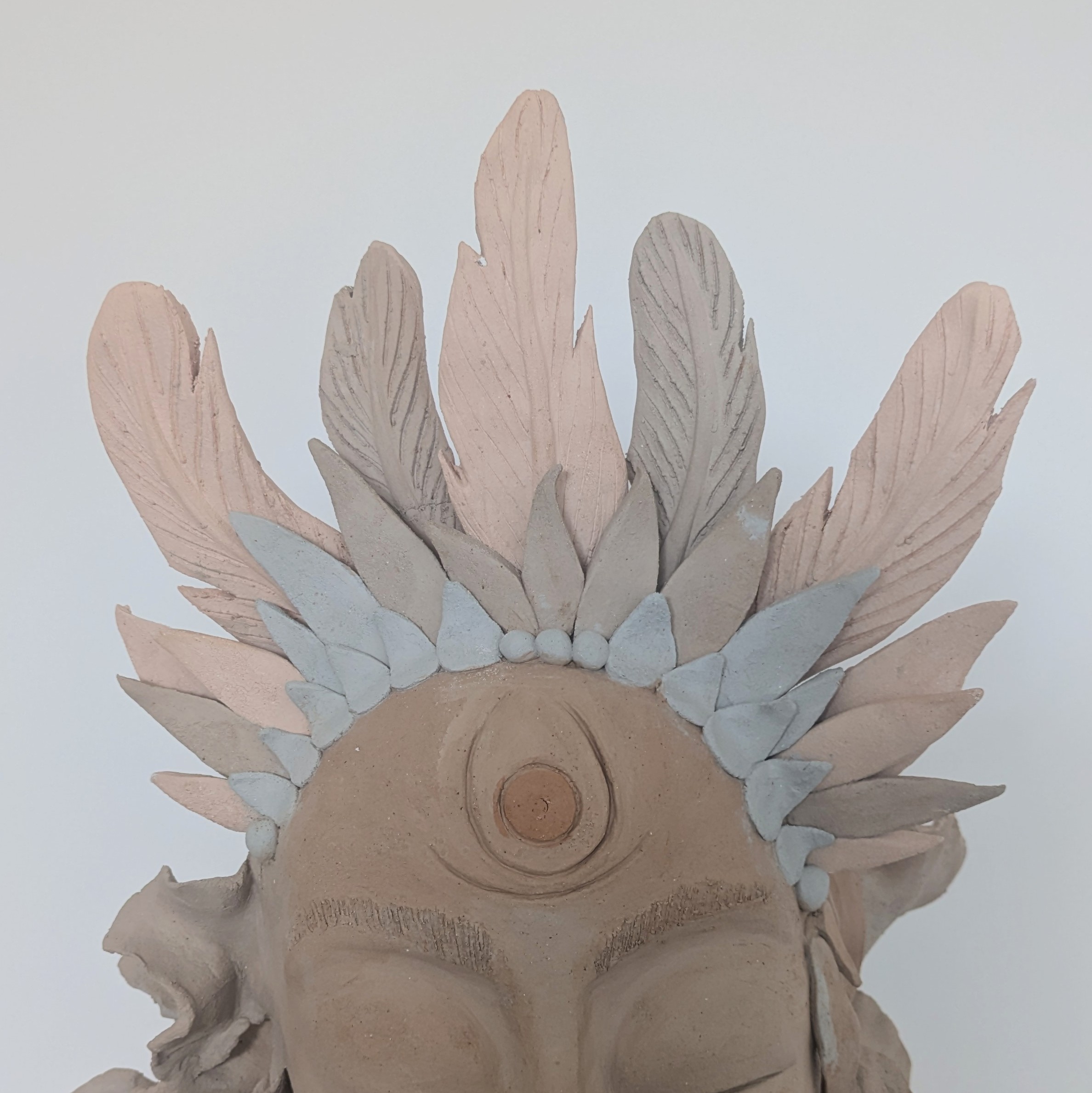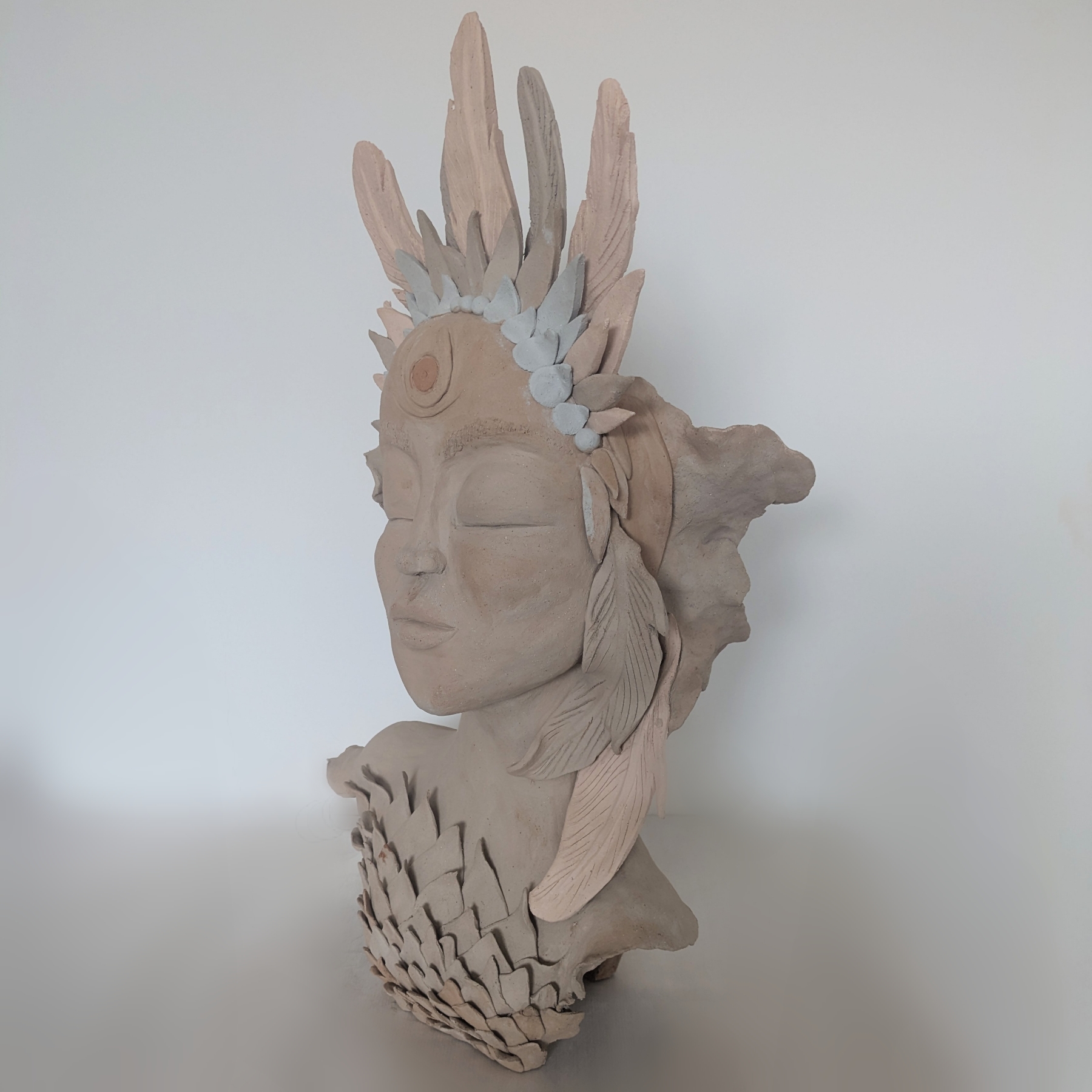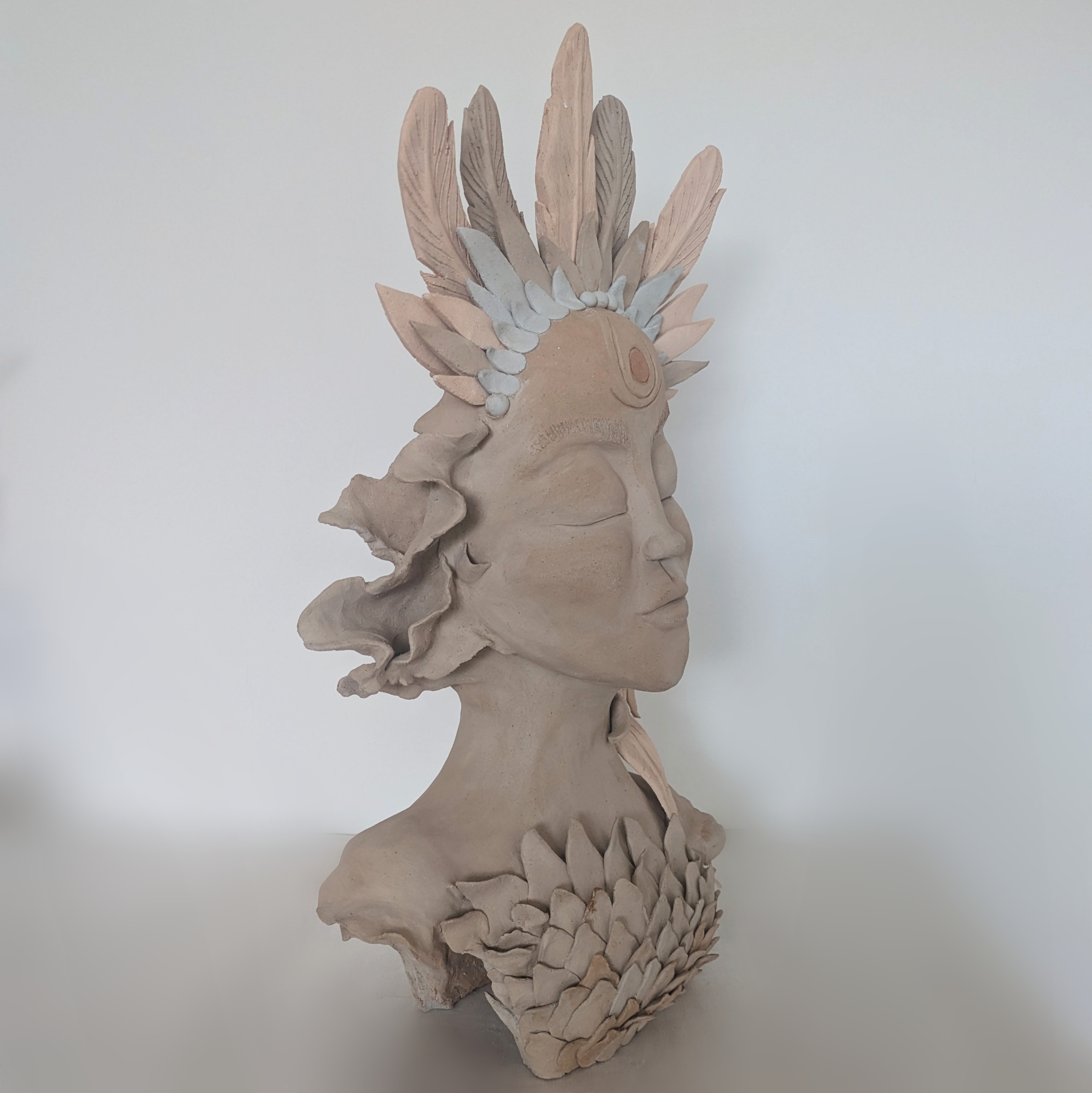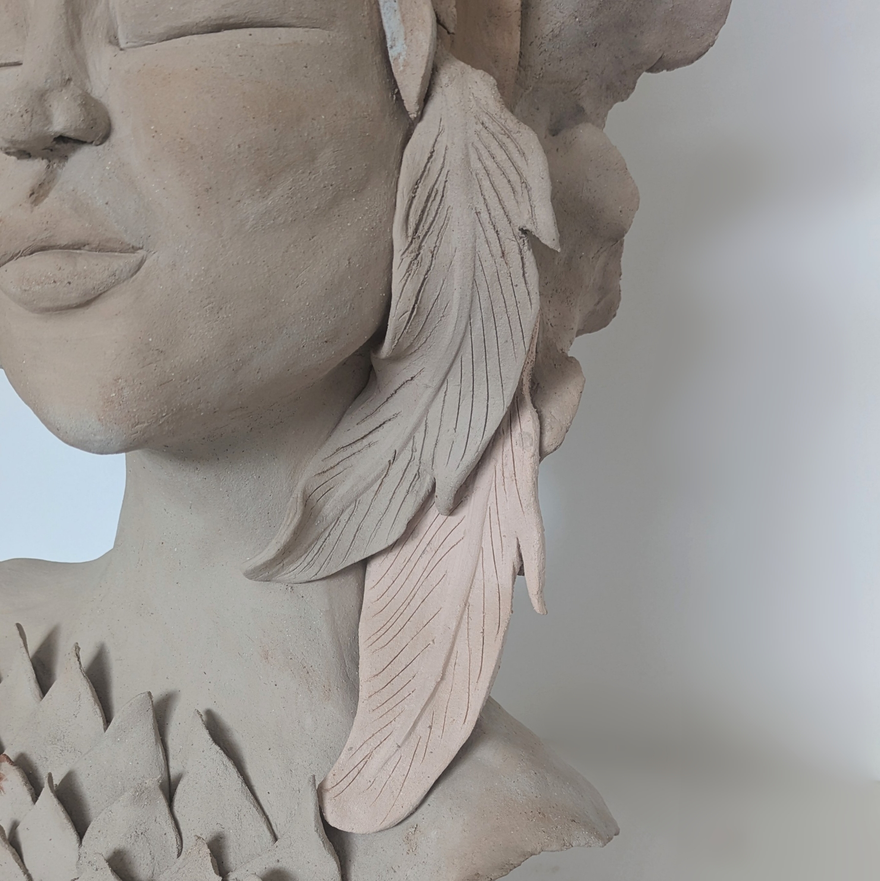 Amérindienne aux yeux clos. Coiffe majestueuse, de plumes, teintées de nuances bleutées. La texture du buste, évoque un habit de pétales pour renforcer la sensation d’enracinement et de lien à la nature. Spirituellement, l’œuvre évoque une gardienne du monde intérieur.
