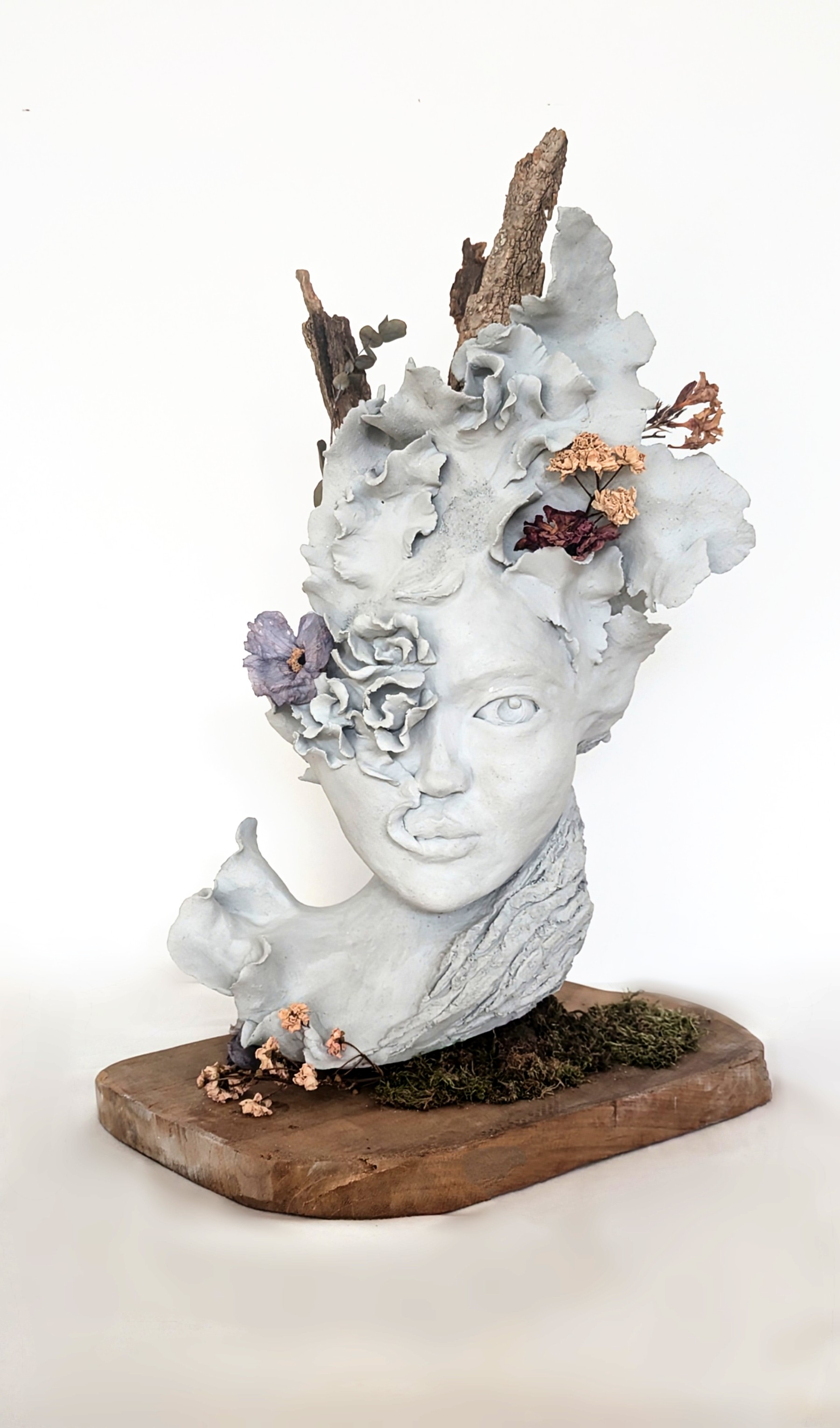 Cette sculpture incarne l’élément terre, mêlant des textures organiques et des éléments naturels tels que des fleurs et des branches. Symbole de la fertilité, de la stabilité et de la connexion profonde entre l’humain et la nature terrestre.
